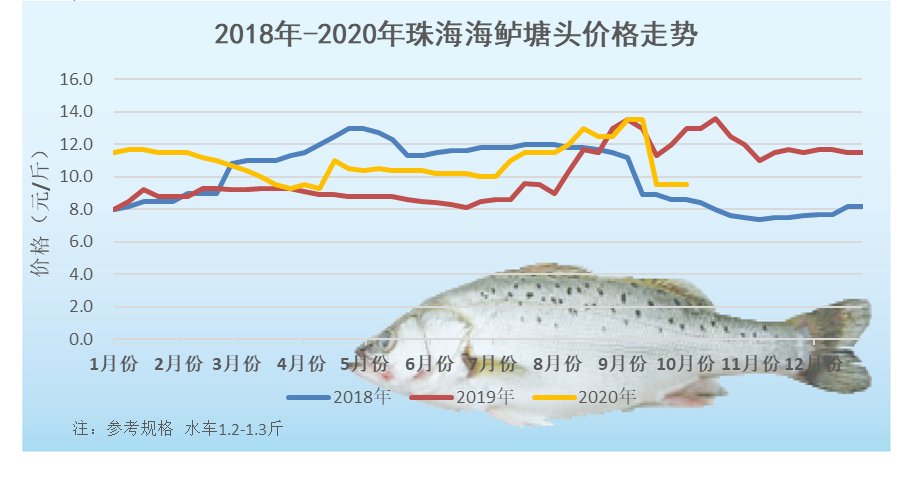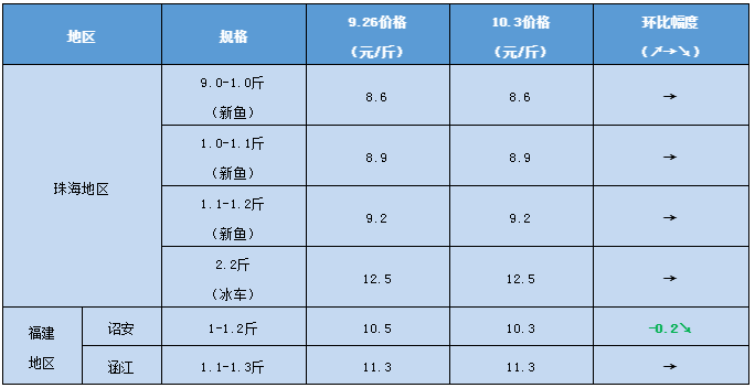 文/ 水產前沿 陳曉慶 感謝進才水產供圖 一周行情分析 中國水產頻道原創報道,珠海:本周珠海海鱸價格穩定。海鱸新魚0.9-1.0斤報價8.6元,1.0-1.1斤報價8.9元,1.1-1.2斤報價9.2元,2.2斤大規格舊魚冰車報價12.5元/斤,與上周持平。 一般海鱸的客戶節前都會提前備貨,現在節假日期間備貨結束,再加上這幾天高速公路堵車嚴重,流通量有所下滑。相對市場銷量來說,海鱸這條魚的市場價格受存塘量影響要更大一些,目前舊魚存塘量少,新魚上市量逐漸增多,價格維持穩定。 目前珠三角堵車的情況已經有所緩解,但國慶結束前預計又將迎來一次大堵車。國慶之后新魚上市量大,消費有所回落,海鱸價格預計會有所下滑。 福建:本周福建海鱸價格穩定,與上周相差不大,但走量增加。由于國慶期間珠三角地區高速塞車嚴重,平時5個小時的車程變成了15個小時,很多水車、冰車都被堵在路上,無法按時到達。而福建這邊流通相對順暢一些,國慶期間走量大幅度上升。 價格走勢 9月26日塘頭報價 說明:上述價格及行情分析僅供參考,市場有風險,入市需謹慎 編號:hlbj2020-10-03 |