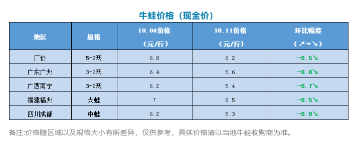 | 中國水產頻道原創報道, 最高又跌0.9元/斤,牛蛙繼續下跌!黑斑蛙價格持穩 文/水產前沿陳曉慶 一周要聞 9月30日,國家林業和草原局發布《關于規范禁食野生動物分類管理范圍的通知》,對64種在養禁食野生動物確定了分類管理范圍。寒露林蛙將禁止以食用為目的的養殖活動,除適量保留種源等特殊情形外,引導養殖戶停止養殖。中華蟾蜍、黑眶蟾蜍、齒緣龜、鋸緣攝龜、緬甸陸龜禁止以食用為目的的養殖活動,允許用于藥用、展示、科研等非食用性目的的養殖。 虎紋蛙不在名錄之內,虎紋蛙管理劃分還在進一步調整中,這是否也意味著泰國虎紋蛙還有望解禁? 據了解,目前大部分泰蛙養殖戶已經更改養殖品種如牛蛙等,但相關的苗種資源、養殖技術都比較匱乏,還得耗費大量的時間和金錢繼續摸索,也有一些養殖戶資金鏈斷裂,選擇棄養去打工,只剩下一些養殖戶還在苦苦等待國家政策的調整,希望能有一個好的結果。 牛蛙行情 今日牛蛙報價(廠價):5-9兩/5-8兩報價6.2元/斤,4-8兩/4-7兩報價6/斤,3-7兩/3-6兩/3-5兩報價5.8元/斤,2-5兩/2-4兩報價5.6元/斤。以上價格僅供參考,不同地區價格有所差異。 本周牛蛙價格繼續下跌。從周二開始,牛蛙廠價繼續下調0.5元/斤,之后就一直保持穩定,目前5-9兩大蛙報價6.2元/斤。而現金價格方面,廣州3-6兩蛙現金價只有5.6元/斤,相比廠價要低2-3毛。目前市場價格低,現金抓蛙困難,很多養殖戶都不愿意出。 國慶節之后消費回落,牛蛙訂單量都有所減少。目前長沙市場批發價格也只有6-6.5元/斤,岳陽市場也只賣到6元/斤。 目前正是轉季的時期,氣溫變化大牛蛙容易生病,有些抓蛙的到塘頭看到紅腿就會放空車,以期蛙價的上漲。 黑斑蛙行情 本周黑斑蛙行情繼續穩定,國慶后氣溫降低,多股冷空氣又將襲來,黑斑蛙捕捉難度加大,供應量減少,后市價格有望上漲,但還是得看消費市場的情況而定。 |