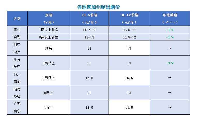 | 中國水產頻道原創報道, 文/圖何氏水產、水產前沿李靜 加州鱸 1、本周佛山加州鱸塘頭價格7兩上報價10.5-11元/斤,比上周下跌了1元/斤,8兩上報價11.5-12元/斤,比上周也下跌了1元/斤,具體還是看魚頭定價,魚頭越小價格越便宜。目前廣東魚價還是比亂的,成交價格也會按魚頭的大小,及質量的情況上下浮動。節后市場銷量也明顯下滑,但整體加州鱸的供應還是比較充足,預計接下來價格上漲空間不大。 2、湖州本周統貨報價13元/斤,跟上周一樣。本地新魚大量上市,多周邊水車到本地抓魚。 3、江蘇吳江本周價格比上周下跌了3元/斤,8兩上報價13元/斤。價格會根據魚頭大小及規格比例多少略有調整。當地很少出魚了,流通商多到周邊收魚。 4、四川成都今天報價9兩上15.5元/斤,跟上周一樣。新魚規格偏小,大規格魚需求偏多。 5、湖南華容本周價格跟上周一樣,8兩上報價是13元/斤。目前魚不多,市場流通一般。廣西南寧本周價格跟上周一樣,報價還是14.5元/斤,當地養戶出魚積極性較高。 |
