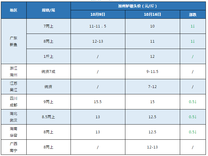 文 鱖鱸前沿 許鈺淇 本周行情 中國水產頻道原創報道,廣東佛山:本周佛山地區加州鱸7兩規格10元/斤,較上周五價格下調0.5元/斤。8兩規格11元/斤,較上周五價格下調1-2元/斤不等,較本周三價格止跌,但在外圍魚價任然有下行趨勢,據了解外圍有養殖戶8.5兩規格,魚頭1.56定價11元/斤。1斤上價格12元/斤。具體價格需看魚頭大小和炮頭魚比例定價。由于9兩、1斤價格偏高,有流通商說現在比較少抓9兩、1斤的魚。目前廣東養殖戶出魚較積極,加上近來諾卡氏菌病害嚴重,病魚數量越來越多,甚至拉網過后出現問題的魚塘數量也有所增加,養殖戶出魚前后需做好抗應激措施。 浙江湖州:統貨打樣7-12元/斤,據了解,浙江價格目前處于混亂狀態,即使同樣7成魚9-11.5元/斤,價格區間非常大,養殖戶排隊出魚。目前菱湖規格以7成偏多,也是市場的主要流通規格,放苗晚的魚目前也有5-6成規格。 江蘇吳江:據悉吳江目前魚極少,流通商一般會去菱湖抓新魚,以統貨打樣7-12元/斤的方式抓魚。 四川成都:9兩上價格15元/斤,較上周價格下跌0.5元/斤,較本周三價格保持不變,目前主產區(大邑、崇州等)新魚正上市,預計后期還有降價的可能性。 湖北武漢:武漢地區8兩半起抓,價格12.5元/斤,價格較上周五下調0.5元/斤,較本周三價格保持不變。塘口8兩報價11.8-12元/斤。 湖南華容:8兩起抓,價格12.5元/斤,較上周五價格下調0.5元/斤,較本周三價格波動不大,有養殖戶透露,明天甚至還要跌0.5元/斤。據了解,以目前新魚的價格來說,養殖戶的利潤空間不是很大,影響養殖戶出魚積極性。當地魚中還透露,目前湖南能賣的魚也不多,因為前一波出魚高峰已經過了,現在處于規格養成的階段,預計下個小高峰在8-10天后。 廣西南寧:8兩上價格12-13元/斤,當地養殖戶出魚積極。 7大產區加州鱸塘頭價對比 編號:jzlbj2020-40/10-16 注:上述價格及行情分析僅供參考,市場有風險,入市需謹慎。 |