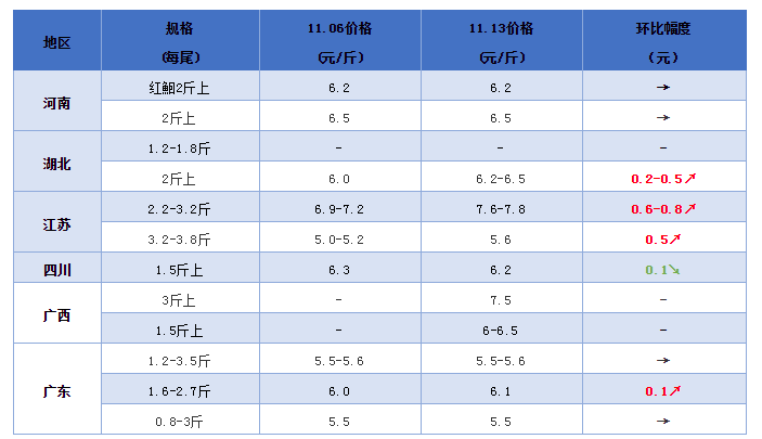 文/ 水產(chǎn)前沿 曾玲程 2020年鮰魚行情走勢(shì) 整體行情綜述 中國(guó)水產(chǎn)頻道原創(chuàng)報(bào)道,養(yǎng)殖戶待價(jià)而沽,北方開始拉動(dòng)上漲。目前,華北的需求上漲,帶動(dòng)行情上揚(yáng)。華北本地鮰魚不多,加上天氣轉(zhuǎn)冷,養(yǎng)殖戶出魚謹(jǐn)慎,靜待價(jià)格上漲。江蘇拉北京貨是7.6-7.8元/斤,天津到北京貨7.3元/斤。相應(yīng)的,兩湖地區(qū)開始積極出魚,拉往四川、貴州等地,沖擊了當(dāng)?shù)仵t魚行情,上漲比較乏力,甚至開始回落。不過有養(yǎng)殖戶表示,天氣已經(jīng)開始轉(zhuǎn)冷,挨過這波沖擊,行情必然上漲!據(jù)筆者了解,目前養(yǎng)殖戶壓塘待價(jià)情緒也較濃,對(duì)后市行情有很高期待。 各產(chǎn)地行情分析 河南地區(qū):2斤上規(guī)格黑鮰塘頭價(jià)6.5元/斤,1.8-2斤規(guī)格紅鮰6.2元/斤,整體行情比較穩(wěn)定,不過也有魚中告訴筆者他們裝魚是5.5-6元/斤。據(jù)悉目前已有部分養(yǎng)戶停料,若后市無滿意價(jià)位,開春前應(yīng)不會(huì)再動(dòng)網(wǎng)出魚。 湖北地區(qū):四川、貴州等地拉動(dòng),湖北地區(qū)價(jià)格開始上漲,可是仍有部分養(yǎng)殖戶不愿意出魚,并預(yù)估后市行情仍有上漲區(qū)間。 江蘇地區(qū):華北本地存貨不多,帶動(dòng)了江蘇地區(qū)價(jià)格上漲。江蘇發(fā)北京貨標(biāo)準(zhǔn)魚是7.8元/斤左后,比天津稍微高一些。 四川地區(qū):外地貨沖擊,四川當(dāng)?shù)仵t魚行情并不樂觀,下調(diào)了1-2毛,價(jià)格在6.1-6.3元/斤波動(dòng)。 兩廣地區(qū):因?yàn)閮珊貐^(qū)拉往貴州,廣西也受到?jīng)_擊,甚至有業(yè)者告知筆者目前可以說是行情低迷,網(wǎng)箱魚掉價(jià)比較厲害。不過在廣東,也有養(yǎng)殖大戶表示,隨著天氣轉(zhuǎn)冷,北方出魚下降,只能南方供貨,再等一段時(shí)間,行情必然上漲。 鮰魚報(bào)價(jià) 說明:1.上述價(jià)格及行情分析僅供參考,市場(chǎng)有風(fēng)險(xiǎn),入市需謹(jǐn)慎 2.塘頭價(jià)指從池塘抓魚價(jià)格,紅鮰指紅色斑點(diǎn)叉尾鮰,黑鮰指黑色斑點(diǎn)叉尾鮰 編號(hào):hybj2020-11-13 特別感謝龔?fù)壬鷮?duì)本文的支持! |