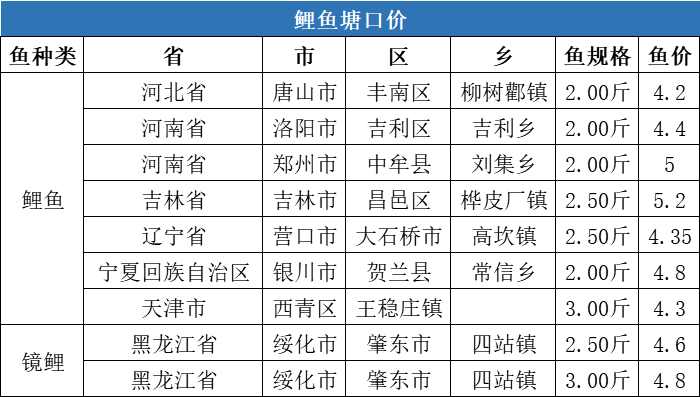 文章來源:通威農牧 作者:張梅 中國水產頻道報道,數據分析:本周全國鯉魚塘口均價4.63元/斤,同比下跌6.09%,環比上漲1.31%。 華北片區:黑龍江出魚較少,外地魚較多,魚販收魚要求較高,價格上漲0.1元/斤。吉林本地未出魚,市場供應量較少,價格上漲0.1元/斤。天津、沈陽養殖戶賣跌不賣漲,出魚減少,價格上漲0.2-0.3元/斤。 華西片區:寧夏受外省魚沖擊減少,價格上漲0.2元/斤。 |