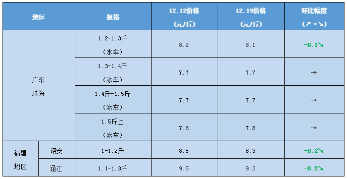 文/ 水產(chǎn)前沿 陳曉慶 感謝進(jìn)才水產(chǎn)供圖 一周行情分析 中國(guó)水產(chǎn)頻道原創(chuàng)報(bào)道,珠海海鱸:本周珠海海鱸冰車(chē)價(jià)格保持穩(wěn)定,水車(chē)價(jià)格有所下跌。1.5斤以下包括1.5斤規(guī)格,打冰報(bào)價(jià)7.7元/斤;1.5斤以上規(guī)格打冰報(bào)價(jià)7.8元/斤。水車(chē)1.2-1.3斤規(guī)格報(bào)價(jià)8.1元/斤,相比上周下降了0.1元/斤。 隨著存塘魚(yú)規(guī)格的增大,以及清塘出魚(yú)的增多,繼上周珠海海鱸冰車(chē)出現(xiàn)跌價(jià)之后,本周海鱸水車(chē)價(jià)格也有所下跌。受存塘壓力的影響,即使在元旦之前市場(chǎng)價(jià)格也難以出現(xiàn)上漲的跡象,按照往年的價(jià)格趨勢(shì)來(lái)看,預(yù)計(jì)得等到春節(jié)之前價(jià)格才會(huì)出現(xiàn)緩慢的回升。 目前珠海海鱸正處于投苗高峰期,主要以大廠為主,散戶(hù)還在觀望中。根據(jù)市場(chǎng)反饋,目前珠海已經(jīng)投了一億尾左右的鱸魚(yú)苗,現(xiàn)在標(biāo)粗的塘口半數(shù)虧本,后面的苗量可能會(huì)有所減少。 福建海鱸:本周福建海鱸價(jià)格也出現(xiàn)了下跌,詔安海鱸報(bào)價(jià)8.3元/斤,涵江海鱸報(bào)價(jià)9.3元/斤,相比上周下降了0.2元/斤。 價(jià)格走勢(shì) 12月19日塘頭報(bào)價(jià) 說(shuō)明:上述價(jià)格及行情分析僅供參考,市場(chǎng)有風(fēng)險(xiǎn),入市需謹(jǐn)慎 編號(hào):hlbj2020-12-19 |
