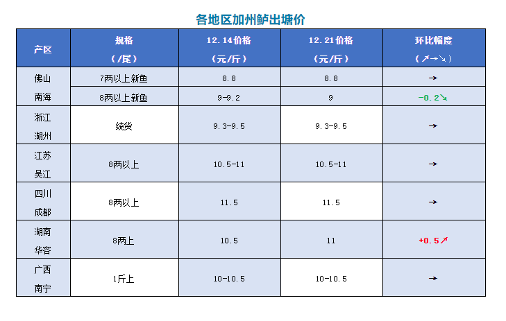 | 中國(guó)水產(chǎn)頻道原創(chuàng)報(bào)道, 文/圖 何氏水產(chǎn)、鱖鱸前沿 加州鱸 1、本周佛山加州鱸大規(guī)格魚(yú)塘頭價(jià)格有小幅下滑,7兩上報(bào)價(jià)8.8元/斤;8兩上報(bào)價(jià)9元/斤,比上周下跌了0.2/斤;1斤上9.1/斤,比上周也下跌了0.2元/斤。具體還是看魚(yú)頭定價(jià),價(jià)格按上車(chē)規(guī)格、塘魚(yú)質(zhì)量情況略有調(diào)整。臨近年底加上降溫,部分養(yǎng)戶集中出魚(yú),外圍產(chǎn)區(qū)也在相繼清塘,整體出魚(yú)量較大。大規(guī)格魚(yú)走量依然很大,但對(duì)大肚魚(yú)挑的較為嚴(yán)格,壓價(jià)厲害。預(yù)計(jì)接下價(jià)格變化不會(huì)太大。 2、湖州本周統(tǒng)貨報(bào)價(jià)9.3-9.5元/斤,跟上周一樣,具體看條形、炮頭大小定價(jià)。 3、江蘇吳江本周價(jià)格跟上周一樣,8兩上報(bào)價(jià)10.5-11元/斤。價(jià)格會(huì)根據(jù)魚(yú)頭大小及規(guī)格比例多少略有調(diào)整。本地慣養(yǎng)老口,年前出魚(yú)量不多。 4、四川成都今天報(bào)價(jià)8兩上11.5元/斤,9兩上12.5元/斤。受疫情影響,每天出魚(yú)量不大。 5、湖南華容本周價(jià)格比上周上漲了0.5元/斤,8兩上報(bào)價(jià)是11元/斤。天冷氣溫低,養(yǎng)戶出魚(yú)意愿不強(qiáng),僅個(gè)別養(yǎng)戶趕在年底清塘,大部分養(yǎng)過(guò)冬,明天開(kāi)春再賣(mài)。 6、廣西南寧本周價(jià)格跟上周一樣,報(bào)價(jià)是10-10.5元/斤,市場(chǎng)流通一般,出魚(yú)量少。 |