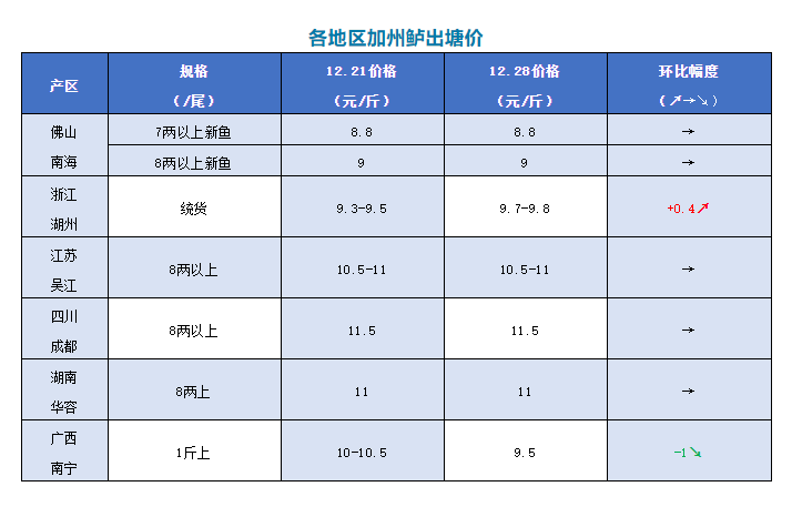 | 中國水產頻道原創報道, 文/圖 何氏水產、鱖鱸前沿 加州鱸 1、本周佛山加州鱸大規格魚塘頭價格保持穩定,7兩上報價8.8元/斤;8兩上報價9元/斤;1斤上9元/斤。具體還是看魚頭定價,價格按上車規格、塘魚質量情況略有調整。近幾日外地水車到本地裝魚量比較大,依然是大規格魚比較受歡迎。但養戶出魚積極性有所下降,除了個別需要資金回籠的養戶和部分清塘的外圍產區的養戶,核心產區的一些養戶部分持觀望態度。預計接下價格變化不會太大。 2、湖州本周統貨報價9.7-9.8元/斤,比上周上漲了0.4元/斤,具體看條形、炮頭大小定價。 3、江蘇吳江本周價格跟上周一樣,8兩上報價10.5-11元/斤。價格會根據魚頭大小及規格比例多少略有調整。本地慣養老口,年前出魚量不多。 4、四川成都今天報價8兩上11.5元/斤,9兩上12元/斤。節前銷量開始慢慢有一些好轉。 5、湖南華容本周價格保持穩定,8兩上報價是11元/斤。當地存塘量大,養戶出魚積極性有所好轉,節前銷量也開始增大了,預計后期價格持續穩定。 6、廣西南寧本周價格跟上周一樣,報價是9.5元/斤,比上周下跌了1元/斤。市場流通一般,出魚量少。 |