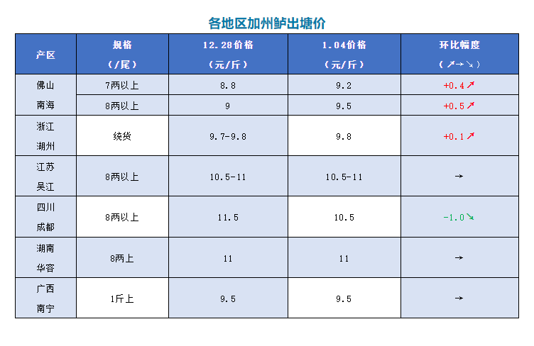 | 中國水產頻道原創(chuàng)報道, 文/圖 何氏水產、鱖鱸前沿 加州鱸 1、本周佛山加州鱸大規(guī)格魚塘頭價格有所上漲,7兩上報價9.2元/斤,比上周上漲了0.4元/斤;8兩上報價9.5元/斤,比上周上漲了0.5元/斤;6兩上9元/斤。具體還是看魚頭定價,價格按上車規(guī)格、塘魚質量情況略有調整。元旦節(jié)日帶動,需求量增加,價格也隨之上漲。再加上天氣寒冷,養(yǎng)戶出魚積極性不高。但從這兩天開始受部分地區(qū)疫情突發(fā)的影響,銷量開始下滑明顯。 2、湖州本周統(tǒng)貨報價9.8元/斤,比上周上漲了0.1元/斤,具體看條形、炮頭大小定價。 3、江蘇吳江本周價格跟上周一樣,8兩上報價10.5-11元/斤。價格會根據魚頭大小及規(guī)格比例多少略有調整。本地慣養(yǎng)老口,年前出魚量不多。 4、四川成都今天報價8兩上10.5元/斤,比上周下跌了1元/斤;9兩上11.5元/斤,比上周下跌了0.5元/斤。節(jié)后爛市,銷量明顯下跌,預計接下來價格上漲機會不大。 5、湖南華容本周價格保持穩(wěn)定,8兩上報價是11元/斤。當地存塘量大,養(yǎng)戶出魚積極性有所好轉,節(jié)后銷量減少,預計后期價格持續(xù)穩(wěn)定。 6、廣西南寧本周價格跟上周一樣,報價是9.5元/斤。市場流通一般,出魚量少。 |