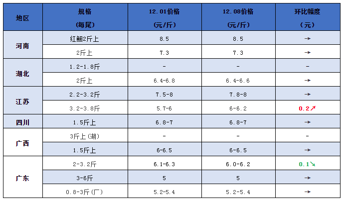 文/ 水產前沿 曾鈴程 2020年鮰魚行情走勢 整體行情綜述 中國水產頻道原創報道,本來看朋友圈,有魚中不夠魚,還以為價格有起色,哪知道反跌1毛! 首先是北方疫情給未來行情添加不確定因素,石家莊市場直接走不通了,河南萬邦市場也有影響,銷量下滑,特別是往北的小規格魚。另外就是全國銷量沒有太大起色,火爆場面不再,搶魚目前基本不太可能。倒是北方多地封冰,拉魚不容易,一直維持比較高的價格。 不過廣東有賣叉尾苗反而比往年同期高5毛。本來行情不好,并且草魚價格漲了不少,應該會影響叉尾投苗積極性。但是因為疫情,還有洪水的影響,今年的苗減產,所以價格有所上漲。 參考苗價:10頭/斤7塊、20頭/斤8塊。 各產地行情分析 河南地區:據海淞水產權沾公、曾紅棉消息,本地2斤上規格黑鮰塘頭價7.3元/斤,紅鮰8.5元/斤。萬邦市場魚商行報價,外地貨2-3斤批發價6.8-7元/斤,超大5.7-5.8元/斤,行情穩定。 湖北地區:塘頭價格標魚一般6塊四五,紅鮰7塊多,行情穩定,不過北上受阻,銷量不大。 江蘇地區:江蘇行情因為水面封冰,出魚難度加大,北京貨報8元,超大有報6.2元。 四川地區:周邊穩定,標魚6.8-7元/斤。外地貨沖擊,高價主要還是樂山周邊可以上7塊。 兩廣地區:廣東價格下調1毛,1.3~3.5斤,5.5元/斤;1.8~3.2斤,6元/斤;2~3斤,6.2元/斤。廣西穩定,1.2斤以上6.2元。 鮰魚報價 說明:1.上述價格及行情分析僅供參考,市場有風險,入市需謹慎 2.塘頭價指從池塘抓魚價格,紅鮰指紅色斑點叉尾鮰,黑鮰指黑色斑點叉尾鮰 編號:hybj2021-01-08 助力鮰魚產業發展,特別感謝各位熱心朋友的信息支持和指點幫助! |