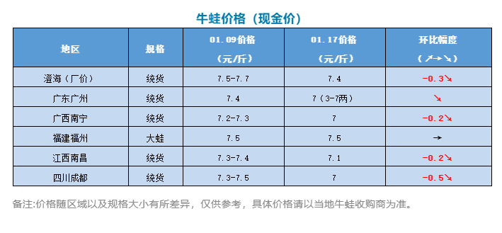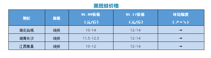 | 中國水產頻道原創報道, 文/水產前沿陳曉慶 牛蛙行情 今日牛蛙現金收購價:6.6-7元/斤,廠價:7.4元/斤左右,目前市場價格混亂,不同廠家補貼價格存在差距。 本周市場牛蛙走量一般,廠價從周三開始下調0.3元/斤,現金價格也持續下跌。據了解,本周廣東地區牛蛙廠價在7.4元/斤左右,不同廠家補貼價格存在差距,3-7兩規格的蛙現金報價7元/斤;湖南湖北地區牛蛙現金價格在6.6-6.8元/斤;四川成都牛蛙現金價格7元/斤;福建地區大蛙報價7.5元/斤,存塘量并不多。 由于多地出現疫情,尤其是河北疫情出現重大變化,全國各地都進一步加強了防疫管控措施,限制人流量較大的聚會、婚禮、壽宴等群體性聚餐活動。據業內媒體統計,截至目前,江西、四川、黑龍江、湖北、陜西、江蘇等超15個省市已經陸續發布通知,要求取消團拜、聯歡、聚餐、年會等群體性聚會和人員密集型活動。 此外,高風險地區則停止聚餐活動,各類餐飲服務單位暫停堂食服務。中風險地區在低風險區防控措施基礎上增加五項內容,包括餐飲服務單位應檢查進店人員“防疫健康碼”并測體溫,符合要求且體溫檢測正常,方允許進店。 目前廣州也建議聚餐人數降至10人,對餐飲業造成了一定影響。 黑斑蛙行情 近期黑斑蛙價格繼續保持穩定,收購價格在12-14元/斤。由于湖南、湖北、江西等地當前氣溫較低,起蛙困難,市場流通緩慢;但另一方面,市場銷量也還沒有起來,黑斑蛙賣不動,價格一時間也難以上漲。年后種蛙出來了價格預計還會有所下跌。 |
