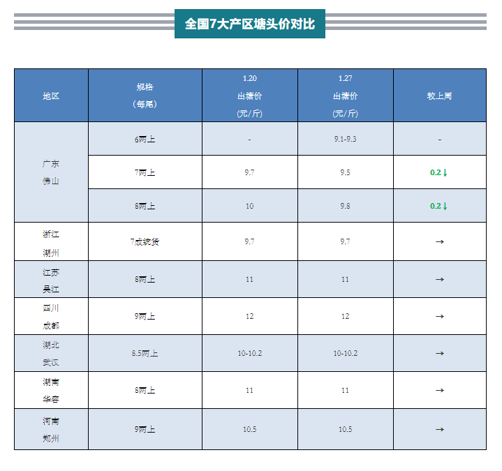 | 中國水產頻道原創報道, 現階段就廣東和浙江兩地出魚量較大,其他產區動靜相對小,基本無新動態 文/水產前沿葉豐齊 圖/杰大飼料 一周行情綜述 現階段就廣東和浙江兩地出魚量較大,其他產區動靜相對小,基本無新動態。廣東佛山主產區養戶需在年底回籠資金,出魚比較積極,加上外圍區域陸續清塘,賣魚集中,市場流通存在一定壓力,7兩及8兩上規格鱸魚報價較上周皆下調0.2元/斤。華東主要產區浙江菱湖的存塘量,在上一輪出魚潮過后有所下降,但大肚魚逐漸增加仍促使養戶積極賣魚,因為供求穩定,行情或保持到春節前。 主產區行情簡析、報價 廣東佛山:主產區6兩上新魚9.1-9.3元/斤,7兩上9.5元/斤,8兩上9.8元/斤,具體價格按上車規格略有浮動。目前主產區規格鱸魚存塘量相對較大,趁著氣溫水溫回升之際,部分需要年底結算和清塘育苗的養戶出魚積極性高,導致市場有點難走量,行情有所下調。同時,不斷增加的大肚魚,挑揀后也將售價壓低0.2-0.4元/斤。外圍養殖區陸續清塘后存塘魚目前所剩不多,但依然扎堆賣魚,對魚市流通亦施加一點壓力。入粵外地魚車數量日前略少一些,估計節前會明顯增加,后市行情還需繼續觀望走量情況變化。 浙江湖州:主產區菱湖5成統貨9元/斤,6-7成統貨9.5-9.6元/斤,7成統貨9.7元/斤,8.5成大統貨10.2-10.3元/斤,與上周報價一致。魚中拉網前先打樣,不過無統一打樣價,要求炮頭規格1.3斤上,具體價錢依據條形體表外觀質量調整,大肚魚裝車要壓價,條形不好看的可能拒收。養戶出魚積極性相對較高,前段時間出過一輪魚后,存塘量有所下降,平均一塘出3萬-5萬斤左右,每天走15萬-20萬斤的量,浙江魚車基本都過來裝魚,按現狀行情應保持到春節前。 江蘇吳江:8兩上報價11元/斤,本地大多養老口魚,少數早苗養戶挑條子后剩下的也養老口魚,目前除零星清理病魚,塘頭無交易。 四川成都:6-8兩規格報價9元/斤,8兩上11元/斤,9兩上12元/斤,價格依然穩定。日前本地市場消化力不錯,每天出魚最多5萬斤,當天可清完進貨。另外,由于外地魚差價縮小,入川數量也較之前減少一些。 湖南華容:8兩上報價11元/斤,行情持平。存塘規格魚逐漸增加,養戶出魚積極性有所好轉,每天出魚量稍為多一些,但萬斤時有時無,看本地小檔口需求而定。 湖北武漢:8兩上報價維持10-10.2元/斤。武漢市場鱸魚消費有一定下滑,以8兩半到9兩規格廣東貨占主流,本地仍正常出魚,但量不大,每天約1萬斤。 河南鄭州:9兩上10.5元/斤,當地鱸魚停料過冬,池塘封冰無交易,價格保持不變。 |
