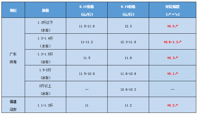 文/ 水產(chǎn)前沿 陳曉慶 價(jià)格走勢(shì) 水產(chǎn)前沿網(wǎng)原創(chuàng)報(bào)道,目前珠海地區(qū)多個(gè)海水魚品種存塘量少,再加上正處于禁漁期,市場(chǎng)價(jià)格依舊保持高位。黃鰭鯛4.5兩魚本周報(bào)價(jià)23.3元/斤,5兩魚報(bào)價(jià)24.8元/斤,相比上周上調(diào)了0.2元/斤;盲曹0.8-1.2斤規(guī)格報(bào)價(jià)12.5元/斤,黃花級(jí)魚報(bào)價(jià)7.8元/斤,價(jià)格以穩(wěn)定為主。 本周珠海海鱸價(jià)格繼續(xù)保持上漲趨勢(shì)。1.3斤下海鱸水車報(bào)價(jià)12.3元/斤,冰車價(jià)格方面1.3-1.6斤規(guī)格報(bào)價(jià)11.6元/斤,1.6-1.7斤規(guī)格報(bào)價(jià)11.4元/斤,1.7-1.8斤規(guī)格報(bào)價(jià)11.2元/斤,1.8-1.9斤規(guī)格報(bào)價(jià)11.1元/斤,1.9-2.0斤規(guī)格報(bào)價(jià)10.9元/斤,2斤以上報(bào)價(jià)10.3元/斤,目前市場(chǎng)舊魚存塘量少,市場(chǎng)需求大,不同魚中報(bào)價(jià)相差較大。隨著珠海海鱸價(jià)格的上漲,福建海鱸價(jià)格也有所回升。 今年海鱸尾批魚的漲價(jià)潮要比往年提前了1個(gè)月左右,主要還是受到舊魚存塘量不足的影響,目前市場(chǎng)預(yù)估珠海舊魚不到400塘,且養(yǎng)殖戶和經(jīng)銷商較為惜售。隨著暑期的來(lái)臨,謝師宴增多市場(chǎng)需求提升,另一方面,廣州、佛山疫情預(yù)計(jì)也將逐漸趨于穩(wěn)定,7月份海鱸價(jià)格有望迎來(lái)新一輪的上漲。 目前高溫天氣來(lái)襲,新舊魚的病害問(wèn)題頻發(fā),提醒養(yǎng)殖戶加強(qiáng)池塘管理,做好調(diào)水、提高免疫力等保健工作。 6月19日塘頭報(bào)價(jià) 說(shuō)明:上述價(jià)格及行情分析僅供參考,市場(chǎng)有風(fēng)險(xiǎn),入市需謹(jǐn)慎 編號(hào):hlbj2021-06-19 |