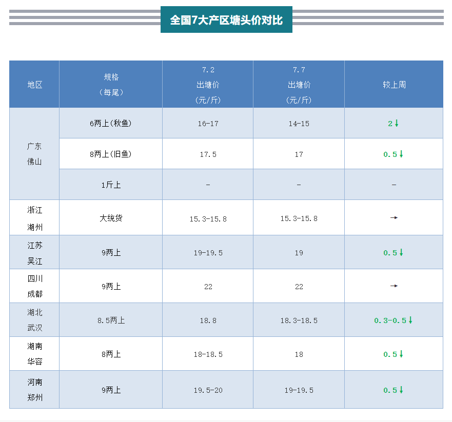 | 中國水產頻道原創報道, 廣東魚價下調后,其他產區受到一定沖擊,部分魚價亦隨之出現下滑 文/水產前沿葉豐齊 圖/杰大飼料 一周行情綜述 廣東佛山加州鱸舊魚感染諾卡氏菌發病相對嚴重,花身、爛身影響賣相,影響賣價,早批秋魚迎來上市高峰,加上病害影響,不斷沖擊舊魚市場,壓縮彼此利潤空間,養戶傾向積極出魚。不過,因為目前北方魚車暫時缺席,僅靠本地車裝魚+本地市場銷售,消化力較為有限,造成行情下行,需要外省魚車入粵拉魚,才會對后市行情有利好。廣東魚價下調0.5元后,其他產區受到一定沖擊,部分產區亦隨之出現了0.5元的下滑幅度。 魚苗方面,反季苗需求持續上升,受限于產能,供應量一直難以滿足市場,促使苗價進一步走高。本周,廣東反季節水花售價大約為600元/萬,較上周上調150元;而200-300口1.1元/尾,上調0.1元。 主產區行情簡析 廣東佛山:舊魚8兩上塘頭正價17元/斤,較上周下調0.5元/斤,實際成交價6兩上需要塘頭圍魚才能發價。秋魚按魚頭及大魚比例圍魚報價,6兩上炮頭1.5斤統貨塘頭價14-14.5元/斤,6兩上炮頭1.8斤且大魚比例足夠大的14.5-15元/斤,較上周皆有所下調。目前8兩-1.6斤的魚相對較好走量,其他規格則沒那么好賣,尤其是1.7斤以上的超大魚,即使無花身、爛身,賣價也有可能受影響。目前魚價波動大,有部分秋魚養戶直接推遲出魚,為提高產量,惜售養大規格。 浙江湖州:菱湖存塘不多,近期塘頭交易少,魚價暫時穩住。8成大統貨15.3-15.8元/斤,無超標、無小夾子、均勻的16元/斤,9兩-1.2斤的5成,整體均勻無超標、無架子16.5元/斤,皆維持上周價格。 江蘇吳江:本地養戶積極出售老口魚,市場行情繼續下行,具體看炮頭大小定價。銷售華東市場為主的8成大統貨15.5-16元/斤,較上周五價格下調0.5元/斤;據悉一天有大約25萬斤的流通量。而部分走華北市場的標魚8兩上18元/斤,9兩上19元/斤,較上周皆下調0.5元/斤。 四川成都:8兩上20元/斤,9兩上22元/斤,暫時維持上周五行情;個別大魚出塘比例較低的9兩上規格報價21.5元/斤。目前本地養戶賣魚相對較積極,水產市場一天應有5萬斤左右的銷量。 湖南華容:8兩上報價18元/斤,較上周五行情下調0.5元/斤。本地魚價滑坡主要由鄰省廣東行情變動引起,高溫外銷受限與病魚增加也有一定影響。 湖北武漢:8.5兩上規格塘頭價維持18.3-18.5元/斤,較上周五報價有0.3-0.5元的下調幅度。受廣東主產區行情動態沖擊,當地魚價出現下滑,擔憂后市態勢的養戶積極賣魚。隨著養殖量上升,今年當地鱸魚市場消化力受其他“打折”養殖品種影響,可能略有縮減。 河南鄭州:9兩上規格塘頭正價19-19.5元/斤,較上周五行情下調0.5元/斤。當地魚價受廣東主產區行情沖擊下行,市場走量相對較少。 |