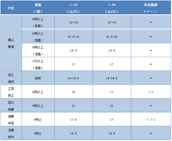 文/圖 何氏水產、水產前沿實習編輯 黃家茵 水產前沿網原創報道,1、本周廣東加州鱸價格基本與上周價格持平,7兩上報價還是16元/斤;8兩上報價16.5元/斤;1斤以上報價還是17元/斤,具體成交價還是根據上車規格、塘魚質量最終來決定,目前大部份都是以出6兩魚為主,偏大魚的老魚價格目前會暫時穩定,接下來主要看供求量是否平衡,或許會迎來小幅的上漲空間。相對老魚來講,目前秋苗的塘頭價格比較亂,從12-14元/斤不等,魚頭在1.5-1.6斤的,魚質量很好的塘頭價最高能賣到14元/斤,最終的成交價也是根據魚的規格、魚頭、質量等綜合因素來決定的,現在已經到了7月中下旬了,秋苗養殖戶的出魚積極性比較高,都在排隊出魚,秋苗整體消費量不大,在供大于求的情況下,價格暫時沒有上漲的空間,養殖戶要根據自己魚塘的實際情況把握好出魚時機。 2、浙江湖州還是大部分以出統貨為主,本周統貨報價14-14.5元/斤,與上周基本持平,本地總體出魚量不大,老口存塘量也不多,養戶出魚積極性也不高,新魚還沒有這么早上市,要等到9月中旬才能上市。 3、江蘇吳江本周價格8兩上報價17元/斤,比上周報價跌1元/斤;9兩以上18元/斤,跟上周基本持平。當地本周養戶出魚積極性還是很高,貨源供應充足,價格或將還會穩定一段時間,同時也會受廣東塘頭價的影響而發生波動的。 4、四川成都今天報價9兩上還是21元/斤,與上周基本一樣,8兩以上塘頭價19.5元/斤。當地養戶目前出魚較之前積極,總體銷量也不是很大,主要滿足本地市場銷售為主,魚價同時也會受到病害影響,質量不好的魚價格會有所下滑。 5、湖南華容本周價格因為受到廣東秋苗價格下跌的影響,9兩上報價比上周下跌了0.5元/斤,報價17元/斤。由于高溫拉魚損耗增大,本地價格與廣東價格沒有明顯的差價,少了很多外來水車來裝魚,出魚量減少。接下來價格也會跟隨廣東價格有所波動。 6、河南鄭州本周價格9兩上18.5元/斤。本地成魚存塘量不多,出塘量也不大,受到廣東魚價的沖擊,流通量更少。 各地區加州鱸出塘價 |