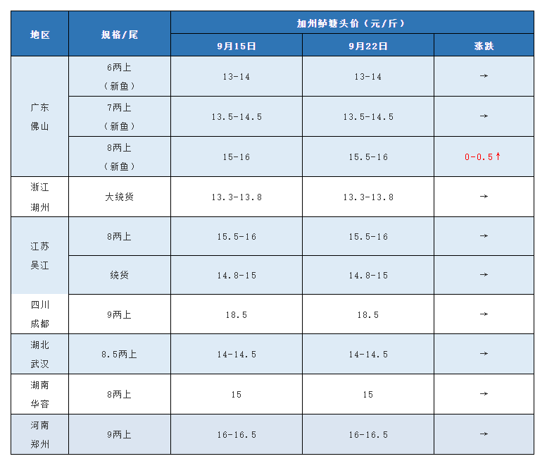 | 中國水產頻道原創報道, 魚多需求少,小規格魚或有跌價趨勢 文/ 水產前沿 實習編輯 黃家茵 圖/ 杰大飼料 一周行情綜述 過去一周,中秋佳節爽市,消費需求有所上升。廣東主產區大魚依然搶手,中秋假期銷量上漲,帶動8兩上規格對比上周有0.5元/斤的漲幅;其他各省主產區總體持穩,如果整體規格夠大,個別魚中或流通開價會再高一些。中秋節假日對鱸魚的消費回升起到了一定拉動作用,雖然整體上魚價漲幅不明顯,但對比其他淡水魚新魚集中上市,供大于求而大魚緊缺,中秋未到就面臨爛市危機,加州鱸表現可謂堅挺。 近期廣東天氣仍然炎熱,高溫拉網和運輸風險大,只有少數幾輛外地車來廣東拉魚,對養戶出魚積極性也有影響。接著其他新魚已經上市的主產區,浙江、江蘇也開始有少量新魚上市了,隨著各地新魚上市量逐漸增加,國慶假期臨近,養戶們需要根據自身情況合理安排出魚。 主產區行情簡析 廣東佛山:中秋假期,消費需求有所上漲,大規格魚8兩上報價15.5-16元/斤,對比上周上漲了0-0.5元/斤。現在市場基本都是新魚,但是目前新魚魚頭偏小,要賣出較高的價位要求的魚頭和大魚比例都比較大。6兩上規格報價在13-14元/斤不等,7兩上規格報價13.5-14.5元/斤,與上周基本相同,魚頭夠大、大魚占比越多,實際成交價會相應略有上浮。現在市場主要還是缺大規格魚,小規格魚的魚量大但銷路有限,需求不大,后續或有跌價的趨勢。 浙江湖州:統貨報價13.3-13.8元/斤,與上周基本相同。菱湖主產區老口魚基本清完,近期市場非常穩定。據悉浙江開始有新口魚上市,不過量還很少,魚中傾向于向外圍抓魚。 江蘇吳江:8兩上報價15.5-16元/斤,統貨報價14.8-15元/斤,與上周基本相同。中秋假期爽市,養殖戶出魚積極性較高。吳江的老口清塘也快結束了,現在上市的新口魚還非常少,缺魚之下魚中有可能往外圍抓魚。 四川成都:9兩上報價18.5元/斤,8兩上報價16.5元/斤,與上周基本相同,近期魚價較為穩定。養戶出魚積極,不過市場缺大魚,大魚越來越少,雖然已有部分新魚上市,但整體規格還偏小。 湖南華容:8兩上報價15元/斤,與上周基本相同。銷量有所好轉,養戶出魚積極性高,老口魚存塘也逐漸見底了,和其他市場一樣,湖南當地也在缺大規格魚。 湖北武漢:8.5兩上報價14-14.5元/斤,與上周基本相同。中秋假期帶動湖北市場消費,近期銷量、走魚狀況都有所好轉,養殖戶們出魚積極性高。只是湖北老口魚較多,現在市場不太缺魚,魚價上漲空間會比較小。 河南鄭州:9兩上報價16-16.5元/斤,與上周基本相同。鄭州市場假期期間爽市,大規格魚搶手,走魚順暢,帶動養戶們出魚積極性上漲。 |