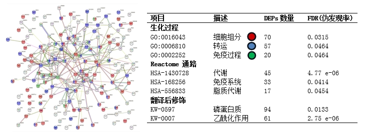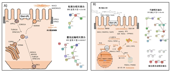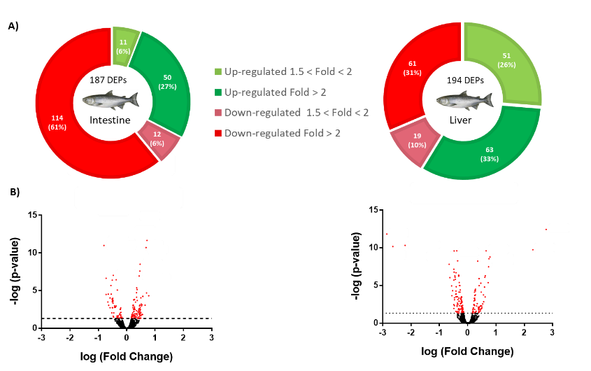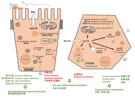 | 水產前沿網獨家報道, 由安迪蘇全球水產研究中心與巴塞羅那大學生物學院共同主導的一項研究結果,于2023年4月發表于《animals》期刊,該研究開創了關于溶血磷脂對魚類生理作用深入模式分析的首例。深入了解溶血磷脂對魚類腸道和肝臟營養代謝作用模式的影響,對指導溶血磷脂在水產動物飼料中的應用具有重要意義。因此安迪蘇中國水產團隊特將該文章關鍵信息提煉整理,以方便國內同行快速閱讀理解。 實驗設計 該實驗在挪威Sunndalsøra Nofima研究站進行。以大西洋鮭(Salmo salar)為養殖動物模型。采用平均重量為160g的魚苗,分為2個處理組,各4個水箱,每個水箱35條魚。分別飼喂對照飼料(C組)和添加了基于LPL的消化增強劑(0.1%乳速來®,安迪蘇提供)的飼料(LPL組),進行12周的養殖實驗。養殖結束后進行生長參數和血漿脂質分析,以及小腸和肝臟蛋白質組學定量。 01 結果 1.1生長性能和血液生化指標 LPL顯著促進了大西洋鮭的生長表現 LPL飼料組魚的終末體重比對照組顯著增加了5%(p<0.05)。LPL對魚的體長沒有影響,因此魚體肥滿度也提高了。LPL飼料組肝臟大小增加了10%以上(p<0.05)。總采食量和飼料轉化率兩組均無顯著差異。見表1。 表1,對照組和LPL組飼料大西洋鮭的生物學參數 數據為平均值±SEM(n=105). 1T檢驗分析僅在p值<0.05時報告 LPL降低了魚體血漿總脂質水平 血漿蛋白質水平未受飼料LPLs的影響。LPL組魚體血漿PL含量的降低,血漿總脂質水平也顯著降低,血漿LDH活性顯著降低(降低30%)(表2)。 表2,對照組C和LPL組大西洋鮭魚的血漿指標。 數據為平均值±SEM(n=10). 1T檢驗分析僅在p值<0.05時報告 2總脂質組分為單條魚血漿各脂質組分總和 3血漿乳酸脫氫酶活性 1.2差異表達蛋白 采用鳥槍法分析了大西洋鮭小腸和肝臟蛋白質組學定量,與大西洋鮭數據庫進行比對。圖1顯示了差異表達的蛋白質(DEPs)和生成的火山圖。 圖1處理LPL組鮭魚腸道和肝臟差異表達蛋白DEPs分析。 (A)腸道和肝臟DEPs餅狀圖。綠色(上調)和紅色(下調)扇形圖數據表示DEPs數據的FC(fold-change)倍數變化幅度區間。(B)腸道和肝臟DEPs的火山圖。火山圖y軸為p值的負對數。 腸道中確定了4984種蛋白質,187種DEPs,61種上調,126種下調。 肝臟中確定了4850種蛋白質,194種EPs,114種上調,80下調。 1.3對腸道上皮細胞功能的影響 LPL顯示出對腸道細胞組分和代謝的調節作用 LPL對腸道上皮細胞的顯著影響體現在GO通路“細胞組分”的影響,包括70種DEPs。57種DEPs涉及運輸通路,顯著影響物質進入、離開或細胞內定向移動。45種DEPs涉及代謝通路,尤其是對脂質代謝(17個DEPs)的調節作用。蛋白磷酸化和乙酰化作用與翻譯后蛋白質修飾相關,蛋白質相互作用(PPI)的功能富集分別包含94和61種DEPs,表明LPLs可能參與這些通路。如圖2所示。 圖2 LPL組鮭魚的腸道蛋白質組相互作用功能富集圖 每個節點代表從腸道黏液樣品中通過鳥槍法蛋白質組學中獲得的一種差異表達蛋白(DEP)。頂部為功能網絡統計的詳細信息。選定的相關生物過程(底部)在每個節點用相應的顏色表示。按照偽發現率(FDR)值,主要Reactome通路和翻譯后修飾顯著聚類總結如下表 LPL改善了囊泡運輸、黏液形成和細胞代謝等特定通路 飼料LPLs引起的細胞重組中,腸道上調的DEPs構建的交互作用與“細胞內細胞器”高度相關,57種上調的DEPs中50種顯著富集在該通路(圖3A)。對這50種與腸細胞器功能相關的蛋白質進行的更深入分析表明,LPLs改善了“囊泡運輸”、“黏液形成”和“細胞代謝”的特定通路(圖4)。 12種DEPs差異聚類到“囊泡運輸”相關過程(圖4A),如“內泌體和外泌體囊泡”、“高爾基體囊泡”和“囊泡胞內運動”。 LPL提高了腸粘膜細胞的活動,5種上調的DEPs與粘蛋白分泌有關:2種角蛋白(KRT13和KRT15),2種黏蛋白(MUC2和MUC5)和1種酶(GALNT12)。 LPL組動物腸道中,一組廣泛上調的DEPs與“細胞代謝”過程相關(圖4B),如“復合糖類水解”、“糖酵解”、“脂代謝”和“蛋白酶體活性”。 其他上調的DEPs處于蛋白質合成的相關通路中,包括“mRNA成熟”、“蛋白質翻譯”、“蛋白質定位”以及“新形成蛋白的翻譯后修飾(PTMs)”。 圖3 LPL組鮭魚腸道中上調A)DEPs相互作用功能富集圖 圖4 LPL組鮭魚腸中上調的功能通路圖。上調DEPs的主要功能關系推測(UniProtKB) LPL顯示出下調腸道應激反應 腸道119種下調DEPs中19種DEPs聚類為“應激反應”,7種DEPs為“病毒處理”,4種DEPs為“I型干擾素信號通路”,有些蛋白質歸屬其中的2種聚類,1種歸屬于所有聚類。 1.4對肝臟功能的影響 LPL對肝臟脂質代謝、氨基酸代謝和碳水化合物代謝的上調作用 LPL組魚體肝臟中174種DEPs相互作用網絡110種DEPs聚類"代謝過程"(圖5),56種顯著聚類代謝反應通路,18種聚類“脂質代謝”,21種聚類“固有免疫系統”。與腸道中觀察到的相似,一些DEPs受翻譯后修飾的影響:103種DEPs可被磷酸化,72種DEPs可被乙酰化,表明飼料LPLs可能參與這些通路。 肝臟中上調的DEPs中,69種聚類為“代謝過程”,42種聚類“轉運過程”。LPLs引起肝臟上調的代謝通路靶點為“脂質代謝”(14種DEPs)、“氨基酸代謝”(9種DEPs)、“碳水化合物代謝”(6種DEPs)以及“三羧酸循環”。 肝臟中74種下調的DEPs功能富集分析顯示,LPLs主要影響與“應激反應”(49種DEPs)相關,這與腸道下調應激反應一致。 圖5 LPL組鮭魚的肝臟蛋白質組相互作用功能富集圖 1.5飼料中LPL假定作用模式總結 LPL明顯改