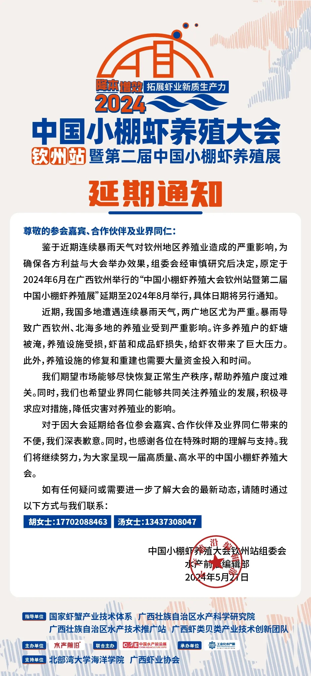 | 水產(chǎn)前沿網(wǎng)獨(dú)家報(bào)道, 關(guān)于中國(guó)小棚蝦養(yǎng)殖大會(huì)欽州站 暨第二屆中國(guó)小棚蝦養(yǎng)殖展 延期舉辦的通知 尊敬的參會(huì)嘉賓、合作伙伴及業(yè)界同仁: 鑒于近期連續(xù)暴雨天氣對(duì)欽州地區(qū)養(yǎng)殖業(yè)造成的嚴(yán)重影響,為確保各方利益與大會(huì)舉辦效果,組委會(huì)經(jīng)審慎研究后決定,原定于2024年6月在廣西欽州舉行的“中國(guó)小棚蝦養(yǎng)殖大會(huì)欽州站暨第二屆中國(guó)小棚蝦養(yǎng)殖展”延期至2024年8月舉行,具體日期將另行通知。 近期,我國(guó)多地遭遇連續(xù)暴雨天氣,兩廣地區(qū)尤為嚴(yán)重。暴雨導(dǎo)致廣西欽州、北海多地的養(yǎng)殖業(yè)受到嚴(yán)重影響。許多養(yǎng)殖戶的蝦塘被淹,養(yǎng)殖設(shè)施受損,蝦苗和成品蝦損失,給蝦農(nóng)帶來(lái)了巨大壓力。此外,養(yǎng)殖設(shè)施的修復(fù)和重建也需要大量資金投入和時(shí)間。 我們期望市場(chǎng)能夠盡快恢復(fù)正常生產(chǎn)秩序,幫助養(yǎng)殖戶度過(guò)難關(guān)。同時(shí),我們也希望業(yè)界同仁能夠共同關(guān)注養(yǎng)殖業(yè)的發(fā)展,積極尋求應(yīng)對(duì)措施,降低災(zāi)害對(duì)養(yǎng)殖業(yè)的影響。 對(duì)于因大會(huì)延期給各位參會(huì)嘉賓、合作伙伴及業(yè)界同仁帶來(lái)的不便,我們深表歉意。同時(shí),也感謝各位在特殊時(shí)期的理解與支持。我們將繼續(xù)努力,為大家呈現(xiàn)一屆高質(zhì)量、高水平的中國(guó)小棚蝦養(yǎng)殖大會(huì)。 如有任何疑問(wèn)或需要進(jìn)一步了解大會(huì)的最新動(dòng)態(tài),請(qǐng)隨時(shí)通過(guò)以下方式與我們聯(lián)系: 胡女士:17702088463 湯女士:13437308047 中國(guó)小棚蝦養(yǎng)殖大會(huì)欽州站組委會(huì) 水產(chǎn)前沿編輯部 2024年5月27日 會(huì)議資訊 會(huì)議主題 降本增效拓展蝦業(yè)新質(zhì)生產(chǎn)力 組織單位 指導(dǎo)單位 國(guó)家蝦蟹產(chǎn)業(yè)技術(shù)體系 廣西壯族自治區(qū)水產(chǎn)科學(xué)研究院 廣西壯族自治區(qū)水產(chǎn)技術(shù)推廣站 廣西蝦類貝類產(chǎn)業(yè)技術(shù)創(chuàng)新團(tuán)隊(duì) 主辦單位 水產(chǎn)前沿 聯(lián)合主辦單位 中國(guó)水產(chǎn)前沿展(CAE) 承辦單位 工業(yè)化水產(chǎn)圈 協(xié)辦單位 安迪蘇生命科學(xué)制品(上海)有限公司 支持單位 北部灣大學(xué)海洋學(xué)院 廣西蝦業(yè)協(xié)會(huì) 銀牌贊助 禮藍(lán)(四川)動(dòng)物保健有限公司 上海漁美美生物科技集團(tuán)有限公司 廈門海約生物科技有限公司 更多合作單位誠(chéng)邀中…… 關(guān)注焦點(diǎn) 1、華南小棚蝦發(fā)展方向與相關(guān)政策解讀 2、廣西小棚蝦海水養(yǎng)殖調(diào)水方案 3、廣西小棚蝦種苗與飼料選擇策略 4、廣西小棚蝦海水源處理與病害防控 5、廣西小棚結(jié)構(gòu)優(yōu)化與升級(jí) 6、廣西小棚蝦尾水處理方案 會(huì)議亮點(diǎn) 1、把脈華南小棚蝦產(chǎn)業(yè)趨勢(shì) 2、打造華南小棚蝦產(chǎn)業(yè)專業(yè)交流平臺(tái) 3、華南小棚蝦產(chǎn)業(yè)前沿企業(yè)榜單公布 4、評(píng)選華南小棚蝦值得信賴園區(qū)與經(jīng)營(yíng)者 參會(huì)報(bào)名 1、會(huì)議注冊(cè) 會(huì)議注冊(cè)費(fèi)用:800元/人(含聽(tīng)課費(fèi)、會(huì)議用餐、會(huì)議資料,交通住宿自理) 提前報(bào)名注冊(cè)享早鳥(niǎo)價(jià):600元/人,現(xiàn)場(chǎng)繳費(fèi)800元/人 敲黑板:規(guī)模養(yǎng)殖者享限量免費(fèi)參會(huì)名額,數(shù)量有限、先報(bào)先得! 2、報(bào)名方式 長(zhǎng)按識(shí)別下方二維碼,添加會(huì)務(wù)組聯(lián)系報(bào)名,煩請(qǐng)備注:姓名+小棚蝦論壇 參會(huì)報(bào)名:水產(chǎn)前沿編輯湯穎琳 【煩請(qǐng)備注:姓名+小棚蝦欽州站】 3、會(huì)務(wù)組聯(lián)系方式 胡女士:17702088463 李女士:13725215269 4、商務(wù)合作 商務(wù)合作聯(lián)系:張女士/13570418360 【煩請(qǐng)備注:姓名+小棚蝦欽州站】 同期活動(dòng):中國(guó)小棚蝦產(chǎn)業(yè)調(diào)研行 往屆回顧 |