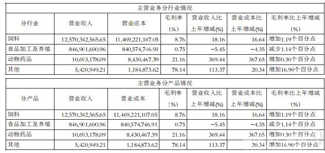 | 以方框圖描述公司與實際控制人之間的產權及控制關系 | 三、管理層討論與分析 3.1經營情況綜述 2012年,結合公司的年度經營目標,公司緊緊圍繞年初制定的"營銷終端 執行到位 有效經營"的方針,以"科技的力量"為主題,促進市場營銷創新與服務轉型,搭建營銷服務的統一平臺,提升對市場終端的開發、服務、管控等執行能力;以強化主營業務產品邊際貢獻管理為導向,優化產品結構,強化盈利能力,落實有效經營。報告期內,公司實現營業總收入1,349,078.53萬元,同比增長16.29%,實現營業利潤8,526.60萬元,同比增長30.79%;實現歸屬上市公司股東的凈利潤9,596.87萬元,同比增長14.64%。 (1)飼料業務 2012年是新修訂《飼料和飼料添加劑管理條例》的宣貫和實施年,飼料、飼料添加劑企業的準入門檻進一步提高,行業整合加速。受復雜嚴峻的國內外宏觀經濟形勢影響,飼料行業同樣面臨著前所未有的挑戰:經營成本大幅攀升,水產品價格出現先揚后抑的巨大反差,畜禽產品價格低迷,原材料價格上漲及部分地區災害天氣等。盡管如此,行業仍繼續保持平穩發展勢頭,呈現出產量穩定增長、質量穩步提高、企業素質不斷提升的整體態勢。 報告期內,公司實現飼料銷售371.67萬噸,較上年增長22.22%,其中水產飼料銷售212.48萬噸,較上年增長29.43%,畜禽飼料銷售159.19萬噸,較上年下降6.55%;實現飼料銷售收入1,257,034.26萬元,比上年增長18.16%;毛利率8.76%,比上年同期增長1.19個百分點。 市場方面,繼續加大營銷投入,引入多家咨詢機構開展營銷變革研究,促進營銷轉型,塑造有效的營銷模式,強化營銷團隊的建設,提高服務終端的執行力;財務方面,以加強產品邊際貢獻的管理為導向,根據行業形勢及市場變化,及時調整經營策略,突出主導產品的核心地位和市場優勢,提高產品盈利能力;人力資源方面,在引進高端管理、技術人才方面取得突破;原料體系,在股份公司層面實行實業公司集中采購、片區層面由下轄核心公司原料部區域集中采購和各分子公司原料部采購相結合的多層采購模式,原料行情分析、采購反應、執行水平大幅提升;投資發展,把握行業規模化發展,整合速度加快的趨勢,繼續將投資資源傾斜于飼料主業。先后簽約了高明、賓陽、福清、天門、銀川等新建項目;考察、論證了廣東、廣西、安徽、河北、黑龍江等儲備項目;在現有工廠實施增設生產線、技術改造項目多項,為公司可持續發展提供了有效保障。 (2)食品加工業務 報告期內,該項業務實現營業收入84,690.16萬元,比上年減少5.45%,毛利率0.75%,比上年減少1.14個百分點。該項業務占公司整體營業收入的6.28%,比去年同期減少1.44個百分點。近年,公司一直在強化食品加工業務的產品、渠道、團隊建設,力爭盡快扭轉該業務的被動經營局面,但是面對國際水產加工品市場持續低迷,國內市場不成熟以及國內屠宰行業的整體不景氣,截止報告期,該項業務的經營結果尚在持續改善中。 (3)證券資本市場 報告期內,公司順利通過并發行了五年期(3+2)公司債(票面利率為5.98%,低于1年期銀行貸款利率),改善了公司長、短期負債結構,降低了公司的財務成本。公司定向增發股票工作順利過會,隨著后續工作的落實,預示著公司的財務結構、費用將得到大力改善。 上述工作的開展,為公司今后在證券資本市場、實體經濟市場的同步發展奠定了良好的基礎,公司的發展實力將得以有效提升。 3.2主營業務分析 (1)利潤表及現金流量表相關科目變動分析表 單位:元 幣種:人民幣