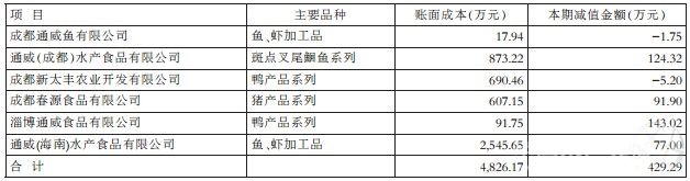 (1)ERDOGAN公司欠通威水產有限公司貨款850.96萬元,系通威水產有限公司的魚片出口到美國,委托他人代售,但魚片銷售滯后,庫存時間長,質量、價格受到較大影響,保管費用高,預計收回凈額不會低于欠款金額的50%,故按50%計提壞賬準備,扣除按賬齡分析已計提壞賬準備85.30萬元,本期單項分析補提壞賬準備340.18萬元。通威水產有限公司另一客戶因違反合同約定拖欠貨款152.09萬元,該款項預計無法收回,公司本著謹慎性原則,本年度全額計提壞賬,扣除按賬齡分析已計提壞賬準備38.02萬元,本年單項分析補提壞賬準備114.07萬元。 (2)ERDOGAN公司欠越南通威有限責任公司貨款499.31萬元,系越南通威有限責任公司出口魚片到美國,委托他人代售,但魚片銷售滯后,庫存時間長,質量、價格受到較大影響,保管費用高,預計收回凈額不會低于欠款金額的50%,故按50%計提壞賬準備,扣除按賬齡分析已計提壞賬準備124.83萬元,本期單項分析補提壞賬準備124.82萬元。 (3)重慶市涪陵通威飼料有限公司5家客戶共計欠飼料款49.49萬元,已進入訴訟催收程序,參照聘請律師意見,對該部分款項按損失金額全額計提壞賬準備,扣除按賬齡分析計提壞賬準備44.09萬元,本年單項分析補提壞賬準備5.40萬元。 2、庫存商品(食品)計提減值 根據企業會計準則及公司會計政策的相關規定,公司對下述幾家子公司的庫存商品、包裝材料參照市場售價扣除相關稅費用后預計可收回金額,測算并計提減值準備429.29萬元,分單位、商品種類列示如下: