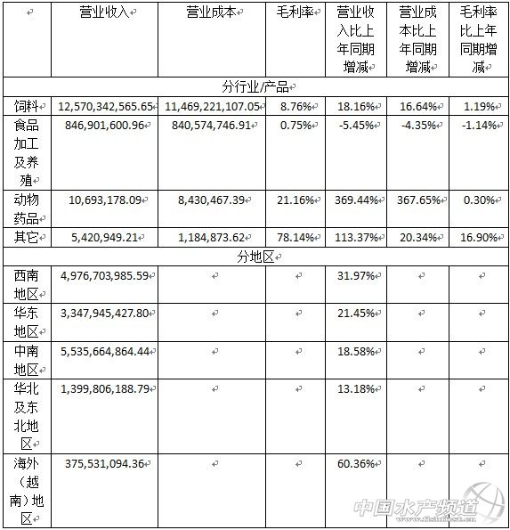 來源:海大集團2012年年度報告 通威股份2012年主營業務構成情況(單位:元) 來源:通威股份2012年年度報告