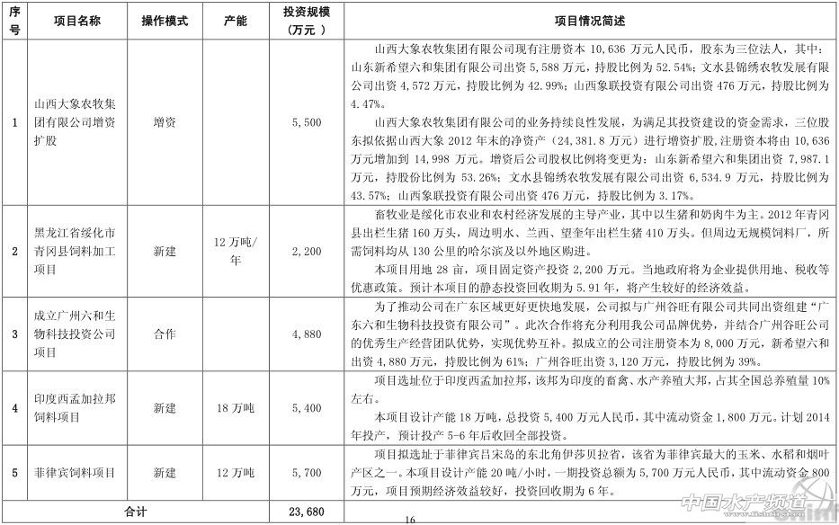 中國(guó)水產(chǎn)頻道報(bào)道,新希望六和股份有限公司22日發(fā)布公告稱(chēng),為了推動(dòng)公司在廣東區(qū)域更好更快地發(fā)展,公司擬與廣州谷旺有限公司共同出資組建“廣東六和生物科技投資有限公司”。此次合作將充分利用我公司品牌優(yōu)勢(shì),并結(jié)合廣州谷旺公司的優(yōu)秀生產(chǎn)經(jīng)營(yíng)團(tuán)隊(duì)優(yōu)勢(shì),實(shí)現(xiàn)優(yōu)勢(shì)互補(bǔ)。擬成立的公司注冊(cè)資本為 8,000 萬(wàn)元,新希望六和出資4,880 萬(wàn)元,持股比例為 61%;廣州谷旺出資 3,120 萬(wàn)元,持股比例為 39%。