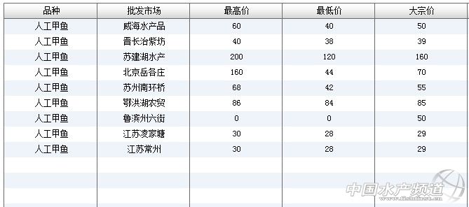 中國(guó)水產(chǎn)頻道獨(dú)家報(bào)道,6月9日全國(guó)主要批發(fā)市場(chǎng)人工甲魚價(jià)格行情如下: