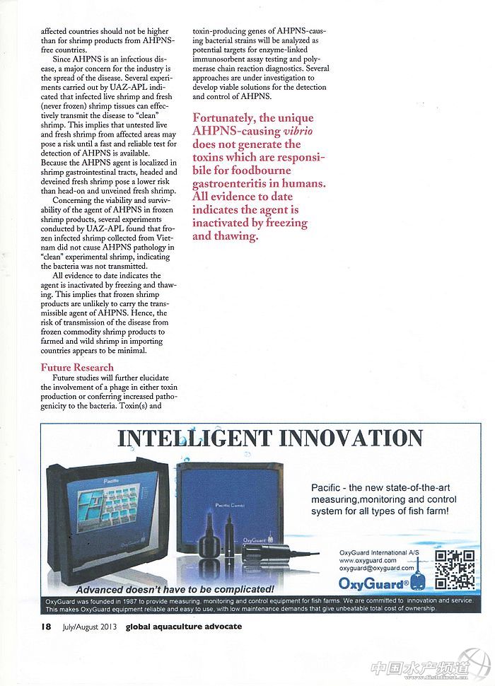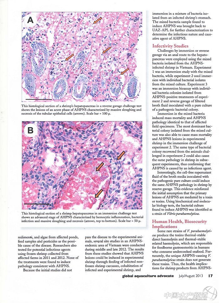概述: 自2009年以來,早期死亡綜合癥(EMS),又稱急性肝胰腺壞死綜合癥(AHPNS)給亞洲的對蝦養殖產業造成了前所未有的沖擊。除了大規模減產外,該疾病還帶來了諸多負面問題,例如:對蝦養殖就業問題、社會福利問題、對蝦供求問題和全球對蝦總體價格問題等等。2013年5月,美國亞利桑那大學水產病理實驗室(UAZ-APL)定義其病原為副溶血弧菌Vibrioparahaemolyticus的特異菌株,該菌株能夠產生毒素并誘導健康對蝦致病;但是,此病原會在冰凍和解凍的過程中失活;感染AHPNS病原的對蝦不會對人類健康造成負面影響。 EMS/AHPNS病理重溫 急性肝胰腺壞死綜合癥爆發于投苗后45天內,目前作用于兩個對蝦養殖品種:南美白對蝦Litopenaeusvannamei和斑節對蝦Penaeusmonodon。感染AHPNS的對蝦肝胰腺白化并萎縮,嚴重時可以觀察到因黑色素沉積而產生的黑斑或黑色條紋,對蝦死亡率可在數天內達到100%。 組織病理學顯示,AHPNS的感染呈現出從基部到末梢的肝胰腺退化和功能障礙,部分細胞從壞死的組織上脫落后進入肝胰腺小管腔和腸道內。在感染的后期,肝胰腺內出現滲入的血細胞,伴隨著繼發性細菌定植其中,引起上皮細胞的大量壞死脫落。此種特殊的病變表明肝胰腺的壞死與毒素介導有關。 前期的研究 2011年至2012年,亞利桑那大學水產病理實驗室曾試圖通過兩方面的研究來尋找AHPNS的病因。第一,在水環境、底質、藻類、飼料和殺蟲劑中尋找可疑的毒素;第二,以冰凍的患病對蝦樣品做人工感染試驗。結論表明,此兩種方法均無法復制疾病。 2012年中后期,在越南的研究實驗中發現,通過投喂非冰凍的患病死亡對蝦,同患病對蝦混養,以及浸泡從患病對蝦消化道中分離出的混合菌株的方法,成功在健康的對蝦試驗池塘復制出了AHPNS癥狀。這些混合菌株的樣本也被送回亞利桑那大學做進一步的分析。 傳染性研究 在亞利桑那實驗室的傳染性研究中,兩種感染方法被依次采用:浸泡法和反向灌胃法(Reversegavage)。所謂的“反向灌胃”,指將病原提取物從肝門反向注射到肝胰腺中。實驗分為三個步驟:1.浸泡混合菌株的人工感染實驗;2.從混合菌株中分離出多個純菌株,依次浸泡感染后篩選純病原菌株;3.對能夠誘導AHPNS的純病原進行生物測定和反向灌胃試驗。 實驗結果表明:1.浸泡混合菌株可造成健康對蝦大量死亡并復制出與AHPNS相同的癥狀;2.浸泡從混合菌株中分離出的優勢純菌株也可以復制出與AHPNS相同的癥狀;3.該菌株可在對蝦體內復制,連續感染兩代對蝦并獲得相同癥狀。由此證實了AHPNS是由傳染性病原引起的。 有趣的是,從接種了純病原的培養基中提取的“無菌”上清液,通過反向灌胃法,可使健康對蝦獲得與AHPNS相同的病理特征。此現象對先前的“毒素介導”假設給予了佐證。利用生物化學和分子生物學手段,亞利桑那實驗室把AHPNS的病原定義為“副溶血弧菌Vibrioparahaemolyticus”的一種特異菌株。 人類健康和生物安全提示 部分副溶血弧菌產生的毒素具有一定的熱穩定性,人類誤食未煮熟的海鮮可能得腸胃疾病。幸運的是,AHPNS的病原副溶血弧菌不會產生熱穩定毒素。 由于AHPNS是一種傳染性疾病,對于養殖業而言,如何控制疾病的傳播是當務之急。亞利桑那大學認為,鮮活對蝦比冰凍對蝦具有更高的傳染性,因此,在AHPNS的快速檢測方法完善之前,從感染地區運輸出鮮活對蝦的風險不容低估。AHPNS病原主要集中在肝胰腺,去頭對蝦相比整蝦在運輸過程中的風險要低得多。 所有證據表明,對蝦在冰凍和解凍的過程中,AHPNS的病原已經失去生物活性。因此,對于進口國來說,冰凍的商品蝦不會帶來太大的疾病傳播風險。 未來研究方向 未來的研究將闡述“噬菌體”在參與弧菌毒素釋放和增強致病力中的作用。通過酶聯免疫吸附測定(ELISA)和聚合酶鏈式反應(PCR)診斷等方法,AHPNS病原體毒素和相關基因將作為主要分析目標。同時,多種疾病探測和控制方法也在逐步完善中。 關鍵詞:EMS AHPNS 南美白對蝦 D.V.Lightner 弧菌毒素