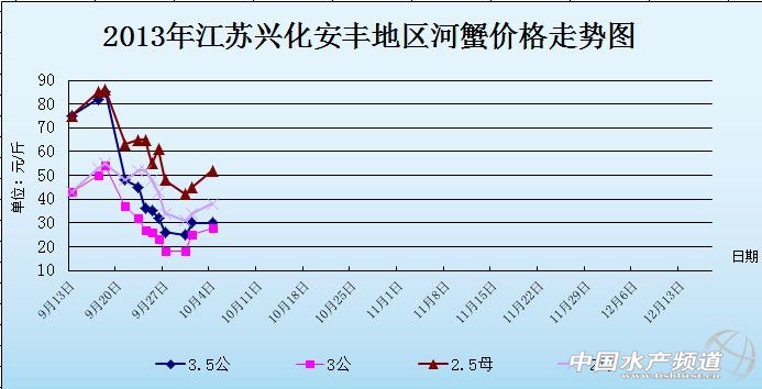 中國水產頻道獨家報道,據網友提供消息,10月4日江蘇興化安豐河蟹價格行情如下: