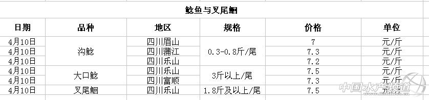 中國水產頻道獨家報道,據海大集團成都海大提供消息,4月10日四川地區鯰魚與叉尾鮰價格行情如下: