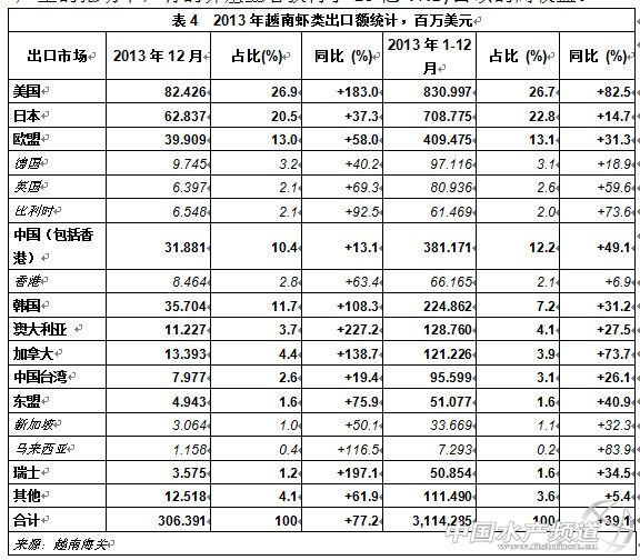 生產(chǎn)情況 中國水產(chǎn)頻道獨家報道,2013年越南水產(chǎn)品產(chǎn)量預(yù)估達605萬噸,同比增長2.1%。其中,捕撈水產(chǎn)品271萬噸,同比增長2.2%;養(yǎng)殖水產(chǎn)品334萬噸,同比增長2%。在養(yǎng)殖水產(chǎn)品中,蝦類為54.8萬噸,同比增長12.3%,鯰魚(亦稱巴沙)為115萬噸,同比下降7.6%。 出口情況 根據(jù)越南海關(guān)數(shù)據(jù),2013年越南水產(chǎn)品出口額超過67億美元,同比增長9.6%。其中蝦類出口額超過30億美元,同比增長39%,鯰魚出口額為17.6億美元,同比增長1%,金槍魚出口額下降至5.27億美元,同比降幅為7.2%,頭足類為4.48億美元,同比下降11%。 越南水產(chǎn)品出口額增長主要與越南蝦類出口額大增有關(guān),2013年越南蝦類出口額占水產(chǎn)品出口總額的46%,其中白對蝦的出口額增幅高達113%,接近16億美元,斑節(jié)對蝦的出口額增幅僅6.2%,達13億美元。 2013年,美國取代歐盟成為越南水產(chǎn)品第一大出口市場,對美出口額達15億美元,同比增長27%,占越南水產(chǎn)品出口總額的22.6%。歐盟成為越南第二大水產(chǎn)品出口市場,這主要與越南蝦類輸歐開始復(fù)蘇有關(guān),對歐盟出口額實現(xiàn)11.8億美元,同比增長4%。 對日本的出口額略有增長,增幅為5%,達11.5億美元。除對墨西哥市場出口額下降2%之外,對其他市場的出口額基本穩(wěn)定或保持小幅增長。 圖1 2013年越南主要出口水產(chǎn)品占比 蝦類出口額大幅上揚。有消息稱,日本當局曾經(jīng)考慮將原產(chǎn)于越南的蝦產(chǎn)品乙氧喹最大殘留限量由0.01ppm提高至0.2 ppm,最終的決定結(jié)果有可能在2014年1月底宣布。在2012年,越南蝦產(chǎn)品輸日曾因日本乙氧喹殘留問題檢查受阻,依據(jù)規(guī)定,不符合要求的蝦產(chǎn)品必須退回,導(dǎo)致成本增高。近兩年來,越南主管當局和蝦企努力解決乙氧喹的殘留問題,越南蝦重新獲得了出口日本的機會。截止到2013年10月,越南蝦對日出口同比增長13%,達5.745億美元。2013年全年對日出口額達7.09億美元,同比增長14.7%。而且,對美國、歐盟、中國、韓國、加拿大、澳大利亞、東盟等市場的出口也在猛增。在湄公河三角洲,2013年底斑節(jié)對蝦收購價在VND240,000-280,000/千克,白對蝦的收購價在VND140,000-190,000/千克,在高價格和高產(chǎn)量的推動下,有的養(yǎng)殖業(yè)者獲得了10億VND/公頃的高收益。 鯰魚出口額增長停滯。與蝦類出口不一樣,越南鯰魚出口在原料魚供應(yīng)短缺導(dǎo)致原料魚價格不穩(wěn)定中復(fù)蘇緩慢,對歐盟的一些傳統(tǒng)市場出口持續(xù)下降。2013年底在湄公河三角洲的鯰魚原料價格為22,000 – 22,500越南盾/千克,比生產(chǎn)成本低VND1,500 – 2,000/千克。 展望 2014年,越南政府決定削減農(nóng)業(yè)、林業(yè)及水產(chǎn)品增值稅,幫助生產(chǎn)商和出口商應(yīng)對低靡的市場需求,緩解企業(yè)經(jīng)濟壓力。預(yù)計越南水產(chǎn)品對中國大陸和香港地區(qū)的出口或?qū)⑿纬尚碌臐撛谑袌觥M瑫r,越南還正在比利時澤布魯日港新建一個“輸歐鯰魚產(chǎn)品配送中心”,這無疑也將幫助越南進一步擴大其輸歐鯰魚產(chǎn)品的銷售覆蓋面。 在全球經(jīng)濟緩慢復(fù)蘇帶動下,水產(chǎn)品需求有望小幅增長,2014年越南蝦類出口有望超過30億美元達35億美元,鯰魚、金槍魚、頭足類和其他海水產(chǎn)品出口均有可能復(fù)蘇。越南水產(chǎn)品加工與出口協(xié)會透露,蝦類仍被確定為越南水產(chǎn)品出口中的主力軍。預(yù)計,2014年越南斑節(jié)對蝦養(yǎng)殖面積為59萬公頃,養(yǎng)殖產(chǎn)量達27萬噸;白對蝦養(yǎng)殖面積將為8萬公頃,養(yǎng)殖產(chǎn)量達29萬噸。在蝦苗質(zhì)量穩(wěn)定,且養(yǎng)殖產(chǎn)品的化學(xué)物質(zhì)和抗生素殘留也能有效控制前提下,2014年越南水產(chǎn)品出口額有望超越2013年,增至70億美元。 【關(guān)鍵字】:越南水產(chǎn)品 水產(chǎn)品出口 水產(chǎn)養(yǎng)殖網(wǎng) 中國水產(chǎn)頻道獨家報道,轉(zhuǎn)載請說明出處《水產(chǎn)前沿》雜志 fuqitext.com ,違者追究法律責(zé)任, 謝謝合作。 |