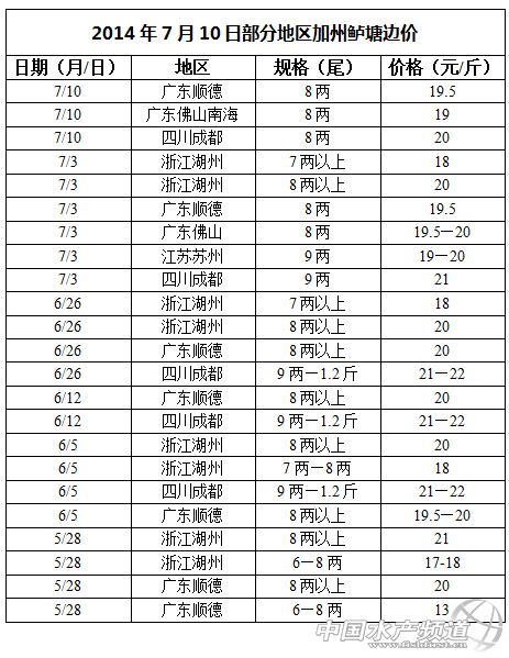 2014年7月10日部分地區加州鱸塘邊價