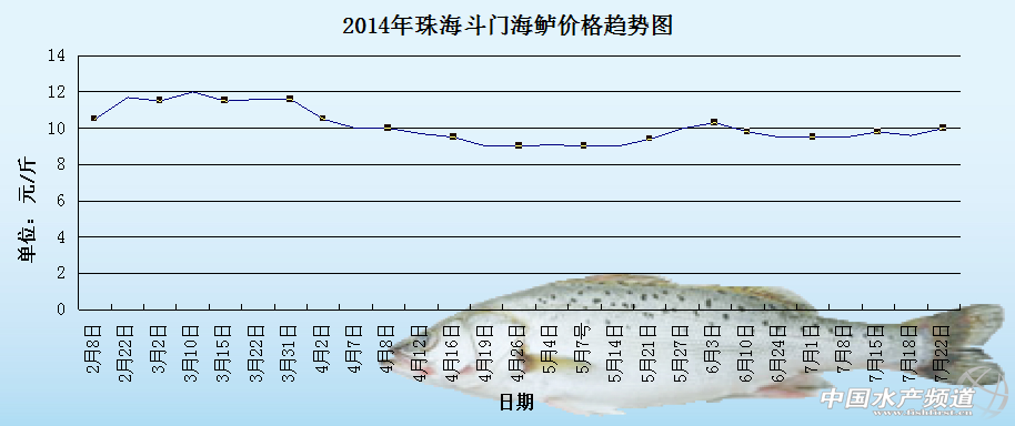 文/中國水產頻道 沈基文 海鱸價格在為期半個月的持續穩定之后,本周終于往上浮動了一點,近期廣東珠海斗門白蕉地區不同規格的海鱸分別上漲了0.2—0.4元/斤,1.2—1.5斤/尾規格的海鱸價格在10—10.2元/斤左右。據珠海強進水產的劉先生表示,漲價的原因可能是由于近段時間謝師宴、升學宴等宴請量的增加帶動了水產品的需求量的提高。據了解,每年7月至9月是海鱸價格最高的時期。下圖是2014年珠海斗門白蕉海鱸價格趨勢圖: 下圖是今天(7月22日)和7月18日珠海地區斗門白蕉海鱸的具體價格: |