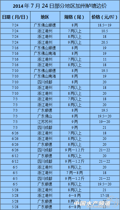 中國水產頻道原創報道,本周浙江湖州地區加州鱸相比上周總體沒有多大的變化,7兩/尾規格價格從17元/斤上周跌至11元/斤,本周又降來0.5元/斤,廣東順德地區的價格跟上周相比基本持穩。今天(7月24日)部分地區加州鱸價格如下: