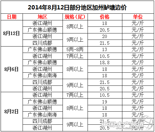 文/中國水產頻道 沈基文 中國水產頻道報道,已經到了8月中旬,全國各地的價格除了四川成都地區持穩之外,浙江湖州地區和廣東佛山地區都有變化,特別是本月8號左右,佛山地區的加州鱸價格每天都漲至不同的價格,漲幅在0.5元/斤左右,8兩以上規格最高達到了21元/斤,直逼一向穩定的四川成都地區加州鱸價格,但是順德地區加州鱸價格自今天又開始有回落的狀態,今天佛山順德地區8兩/尾以上的價格是20.5元/斤,據順德地區的聶先生介紹,目前,加州鱸的價格已然比較高。今天,各地區加州鱸價格如下: 據悉,接下來加州鱸出塘量會慢慢降下來,預計到9月中旬新魚會少量上市,到10月中旬,出塘量將大量增加,屆時可能由于市場供求關系的變化導致魚價下跌。據聶先生給我們提供的數據了解到,2013年11月下旬順德地區8兩上的加州鱸價格在9元/斤左右,12月中旬6-8兩/尾規格的加州鱸價格在8.6元/斤,8兩以上的價格在10元/斤。聶先生表示,今年11月份、12月份行情應該會比去年樂觀。【以上價格及觀點僅供參考】 中國水產頻道(fuqitext.com)獨家報道,轉載請說明出處,違者追究法律責任, 謝謝合作。 【關鍵字】:加州鱸 行情 價格 水產養殖 |