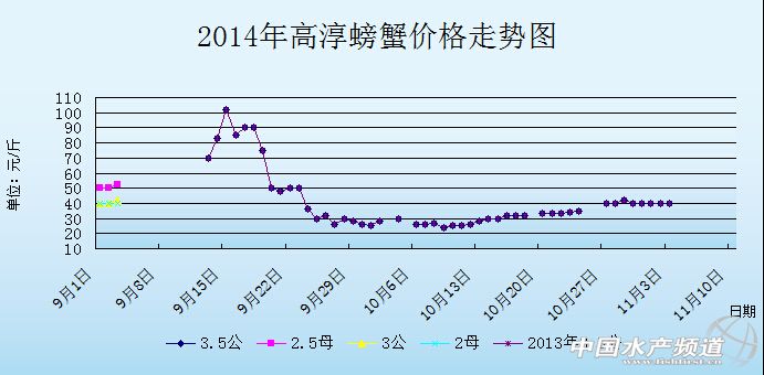 中國水產(chǎn)頻道獨(dú)家報(bào)道,據(jù)網(wǎng)友提供消息,2014年9月3日江蘇高淳河蟹價(jià)格行情如下: 螃蟹 日期 地區(qū) 規(guī)格 價(jià)格 單位 南京高淳 5公 150 元/斤 南京高淳 4.5公 115 元/斤 南京高淳 4公 85 元/斤 南京高淳 3.5公 55 元/斤 南京高淳 3公 42 元/斤 南京高淳 2.5公 30 元/斤 南京高淳 3.5母 150 元/斤 南京高淳 3母 105 元/斤 南京高淳 2.8母 86 元/斤 南京高淳 2.5母 52 元/斤 南京高淳 2母 40 元/斤 南京高淳 1.5母 30 元/斤 南京高淳河蟹價(jià)格信息由南京康旭科技有限公司沈先生(電話:13770896772,網(wǎng)站:http://tb.cn/9a43XVy)提供,由于價(jià)格波動(dòng)及訂貨量影響,以上價(jià)格為收購價(jià)格,實(shí)際價(jià)格請聯(lián)系電話。
