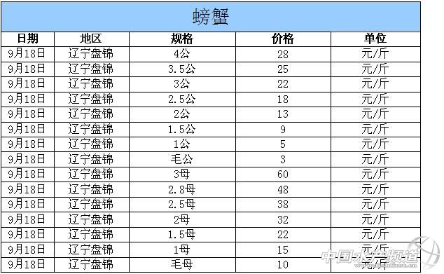 中國水產頻道獨家報道,據網友提供消息,2014年9月18日遼寧盤錦河蟹價格行情如下: 遼寧盤錦河蟹價格信息由盤錦市雙臺子區東風市場華陽河蟹行(電話:18040020068;15942702021;0427~6616465)提供,由于價格波動及訂貨量影響,以上價格為收購價格,實際價格請聯系電話。 |