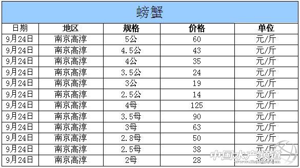 中國水產頻道獨家報道,據網友提供消息,2014年9月24日江蘇高淳河蟹價格行情如下: 南京高淳河蟹價格信息由南京康旭科技有限公司沈先生(電話:13770896772,網站:http://shop110368651.taobao.com)提供,由于價格波動及訂貨量影響,以上價格為收購價格,實際價格請聯系電話。 |