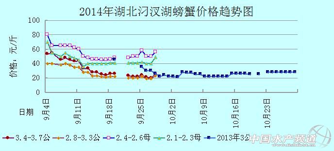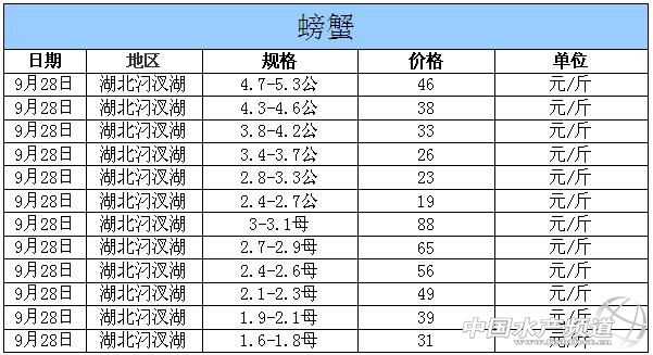 中國水產(chǎn)頻道獨家報道,據(jù)網(wǎng)友提供消息,2014年9月28日湖北汈汊湖主產(chǎn)區(qū)河蟹價格行情如下: 湖北漢川汈汊湖河蟹信息由湖北漢川天歌螃蟹養(yǎng)殖專業(yè)合作社曾先生(13508632620)提供,由于價格波動及訂貨量影響,以上價格為行情價格,實際價格請聯(lián)系電話。 |