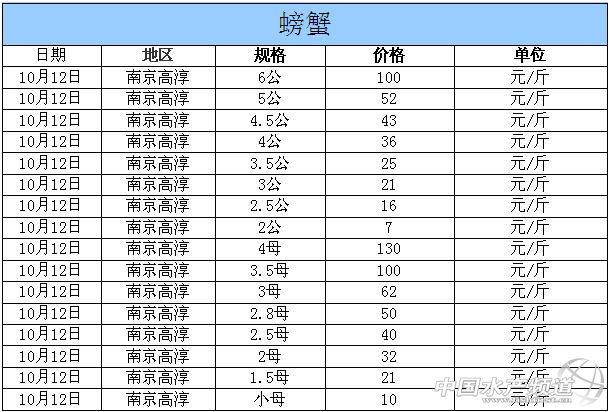 中國水產(chǎn)頻道獨家報道,據(jù)網(wǎng)友提供消息,2014年10月12日江蘇高淳河蟹價格行情如下: 南京高淳河蟹價格信息由南京康旭科技有限公司沈先生(電話:13770896772,網(wǎng)站:http://shop110368651.taobao.com)提供,由于價格波動及訂貨量影響,以上價格為收購價格,實際價格請聯(lián)系電話。 |
