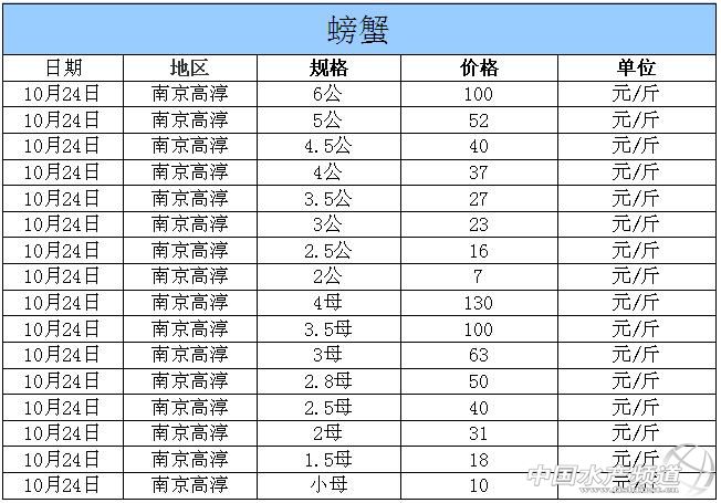 中國水產(chǎn)頻道獨家報道,據(jù)網(wǎng)友提供消息,2014年10月24日江蘇高淳河蟹價格行情如下: 南京高淳河蟹價格信息由南京康旭科技有限公司沈先生(電話:13770896772,網(wǎng)站:http://shop110368651.taobao.com)提供,由于價格波動及訂貨量影響,以上價格為收購價格,實際價格請聯(lián)系電話。 |