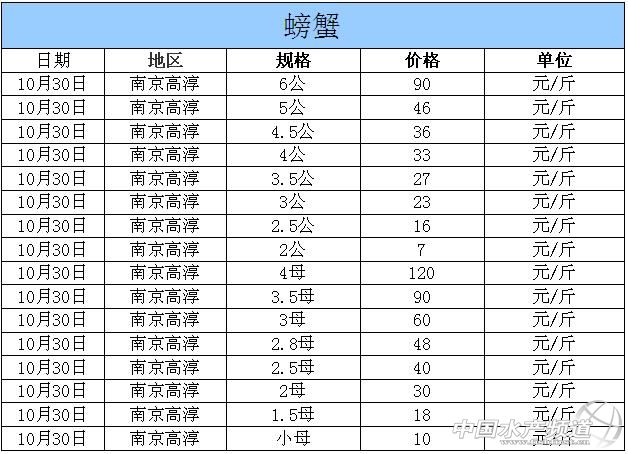 中國水產頻道獨家報道,據網友提供消息,2014年10月30日江蘇高淳河蟹價格行情如下: