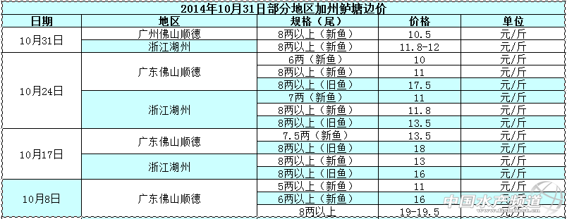 2014年10月31日部分地區加州鱸塘邊價