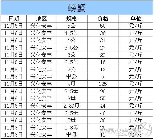 中國水產頻道獨家報道,據網友提供消息,2014年11月8日江蘇興化安豐河蟹價格行情如下: