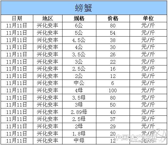 中國水產頻道獨家報道,據網友提供消息,2014年11月11日江蘇興化安豐河蟹價格行情如下: