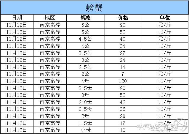中國水產頻道獨家報道,據網友提供消息,2014年11月12日江蘇高淳河蟹價格行情如下: