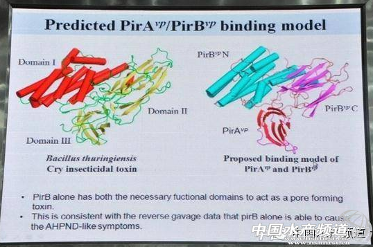 說起羅竹芳教授,或許有的朋友要懵了。羅竹芳教授是臺灣大學生命科學學院院長,擅長病毒分子生物學、甲殼類病毒學的研究。此前國內(nèi)企業(yè)從臺灣引進的白斑病的快速檢測方法也是源于羅竹芳教授團隊。 圖為羅竹芳教授在第九屆世界華人蝦蟹養(yǎng)殖研討會上作報告 文/中國水產(chǎn)頻道 蔡章潔 中國水產(chǎn)頻道獨家報道,前兩天在lightner的文章中已經(jīng)說過PirA和PirB是在副溶血性弧菌的質(zhì)體基因中編碼的毒素蛋白。羅竹芳教授2013年9月開始參與AHPNS的研究工作。此后,組織開展了特異性基因比對開始的工作以及毒素的后續(xù)研究工作。此文,針對羅竹芳教授目前的研究進展進行解讀。 首先,需要明確的一點是,此文討論的AHPNS為Acute Hepatopancreatic Necrosis Syndrome(急性肝胰腺壞死綜合癥),而EMS(早期死亡綜合征)則為更廣泛的概念,AHPNS屬于導(dǎo)致EMS中的一種新病害,其主癥狀為對蝦肝胰腺上皮細胞大量脫落等(具體內(nèi)容參考Lightner的論文)。 進展1 證明PirA和PirB是導(dǎo)致AHPNS的病原 羅竹芳教授發(fā)現(xiàn)副溶血性弧菌質(zhì)體pVA1上編碼的PirA和PirB毒素的基因片段,并證明PirA和PirB毒素是導(dǎo)致AHPNS的病原。 從圖片中可以看到,左上角的圖片為健康的對照組,右上角為單獨的PirA感染對蝦導(dǎo)致對蝦肝胰腺細胞間出現(xiàn)一些“小泡”,并無較明顯癥狀;左下角為單獨的PirB感染對蝦,發(fā)現(xiàn)對蝦肝胰腺上皮細胞出現(xiàn)大量脫落,與AHPNS癥狀吻合度極高;而使用PirA和PirB同時感染時,則出現(xiàn)了AHPNS。 目前,對PirA和PirB的作用機理尚不明確,PirA可能是起某種調(diào)控作用。 進展2: 為什么之前一直難以完成毒素的分離驗證實驗?zāi)兀?/b> 在副溶血性弧菌的質(zhì)體上有一個致死基因,一旦將質(zhì)體“拿出”副溶血性弧菌,致死基因就會“殺死”副溶血性弧菌。這也是原先的病理驗證實驗比較難突破的地方。 進展3 :已分離出預(yù)防AHPNS的抗體 目前羅竹芳教授已經(jīng)可以制造出Pir毒素的抗體IgY,這種抗體是通過注射到雞體內(nèi)獲得的,屬于對蝦的被動性免疫,可以在AHPNS病發(fā)之前拌料投喂。作用主要是與Pir毒素結(jié)合,起中和作用,目前這個抗體還處于定量研究階段,以及成本降低階段。預(yù)計這種抗體使用成本能夠下降到每公斤飼料使用0.1元臺幣的成本。 另外,羅竹芳教授也在做別的一些方法抵抗AHPNS,例如阻斷毒素與抗體結(jié)合。 進展4: AHPNS的PCR檢測已經(jīng)確定 目前檢測AHPNS的手段最精準的是PCR檢測,在2013年底,羅竹芳教授已經(jīng)公布了AP1、AP2兩個檢測序列,這兩個序列主要是檢測質(zhì)體的,使用質(zhì)體檢測只有98%的準確度。目前PCR檢測只能定性檢測,檢出量與發(fā)病之間尚未建立線性相關(guān)。 不過在實驗室條件下,105cfu/ml副溶血性弧菌的水體中浸泡對蝦20-60min,再放到20L的水體中養(yǎng)殖,對蝦會60-80%的致死率。 進展5 :PirA、PirB的結(jié)構(gòu)和昆蟲毒素類似 如圖所示,左邊為蘇云金芽孢桿菌Cry insecticidal 毒素的結(jié)構(gòu),右圖為PirA和PirB的結(jié)構(gòu)。兩者在蛋白結(jié)構(gòu)上相似程度很高,但是基因相似程度僅10%。蘇云金芽孢桿菌具有導(dǎo)致昆蟲致死的功能。 另外,值得說明的是,在2014年第六屆中國對蝦產(chǎn)業(yè)發(fā)展論壇上,何建國教授也發(fā)現(xiàn)了蘇云金芽孢桿菌可引發(fā)對蝦AHPNS,昆蟲與對蝦都屬于節(jié)肢動物,極有可能是AHPNS的病原。 中國水產(chǎn)頻道(fuqitext.com)獨家報道,轉(zhuǎn)載請說明出處,違者追究法律責任, 謝謝合作。 【關(guān)鍵字】:南美白對蝦 羅竹芳 AHPNS 水產(chǎn)養(yǎng)殖 |