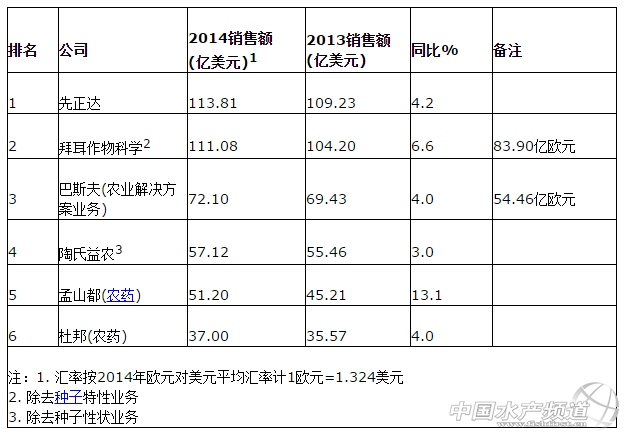 注:1. 匯率按2014年歐元對美元平均匯率計1歐元=1.324美元 2. 除去種子特性業務 3. 除去種子性狀業務 從上表可以看到與去年相比六大跨國公司排名沒有變化先正達以113.81億美元仍居首位拜耳僅以2.73億美元的差距屈居第二!傲蟆碑斨忻仙蕉嫁r藥業務增長最為顯著達到13.1%的增幅也是上述公司中唯一一個實現雙位數增長的企業但由于其財報時間截止至2014年8月31日因此草甘膦行業在去年下半年的慘淡行情并沒有對其整體銷售產生太大影響反之2013年三、四季度的草甘膦行情對其業務增長產生了明顯的助推作用。 從整體來看2013年共有四家公司較2012年的同比增長達到了兩位數的增幅而2014年的增長情況則相對平平四家公司增幅低于5%。 亮點: Syngenta 先正達CEOMike Mack在2014年財報發布會上指出公司的新殺菌劑ELATUSTM在巴西上市后銷售額超過了3億美元這是先正達歷史上產品上市首年銷售額最高紀錄該產品在大豆銹病方面的作用效果得到了種植者們廣泛的高度認可。 Bayer CropScience 拜耳作物科學所取得的市場提升得益于其所有業務領域和區域的貢獻自2006年以來上市的新產品表現尤其突出新產品銷售總額增長約23%超過18億歐元。 BASF 盡管存在匯率因素的不利影響巴斯夫農業解決方案領域全年銷售額仍實現了4%的增長這是該領域有史以來第二佳的全年收益這主要歸功于歐洲和北美業務強勁以及市場對殺菌劑和除草劑需求的增長。 Dow AgroSciences 由于幾乎所有地區市場銷售額都有增加陶氏益農作物保護部2014年銷售額同比增長了3%除草劑、殺蟲劑和殺菌劑均有增長。新作物保護產品增長尤其迅速增幅達到23%其中乙基多殺菌素和Isoclast??殺蟲劑是引領增長的關鍵因素。作物保護業務創造了全年銷售的新紀錄。 Monsanto 孟山都公司預測2015財年公司業績的增長有望建立在轉基因抗蟲和耐草甘膦Intacta RR2 Pro大豆在巴西成功上市的基礎上。公司指出耐草甘膦和麥草畏的Roundup Ready 2 Xtend大豆將在2015財年進入最終商業化準備階段并將在南北美洲2億英畝市場機遇中占領一席之地。 Dupont 杜邦公司指出其業務主要由殺蟲劑和 殺菌劑領軍增長而除草劑的銷售額有所下降。公司的殺蟲劑氯蟲苯甲酰胺和溴氰蟲酰胺均在多個市場取得了進一步增長。據杜邦執行副總裁James C. Borel先生在美國美林銀行2015年全球農業研討會上透露公司氯蟲苯甲酰胺的年峰值銷售額有望達到15億美元其姊妹產品溴氰蟲酰胺的年峰值銷售額將突破5億美元。 注:以上數據僅供參考具體請以各公司年報數據為準。 |