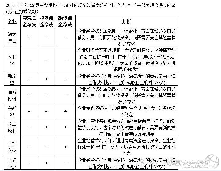 文/ 《水產(chǎn)前沿》、中國水產(chǎn)頻道 唐東東 中國水產(chǎn)頻道獨家報道,截至8月31日,12家主要飼料上市企業(yè)相繼公布了2015年半年度報告,本文對報告數(shù)據(jù)做了相應(yīng)對比和分析。 一、7家企業(yè)共生產(chǎn)1522.72萬噸飼料 上半年,12家飼料上市企業(yè)僅有7家公布了飼料銷量,合計1522.72萬噸,較上年同期增長70.9萬噸。大北農(nóng)、通威股份的飼料銷量出現(xiàn)下滑,其余5家企業(yè)銷量增長,增幅最大的為新希望38.74萬噸、海大32萬噸。 過200萬噸級別的企業(yè)有新希望、海大集團、正邦科技,100萬噸級別的企業(yè)為大北農(nóng)、通威股份。 12家企業(yè)中,唐人神、通威股份、大北農(nóng)等3家企業(yè)高度依賴飼料業(yè),飼料業(yè)務(wù)為公司貢獻了超過90%的收入。天康生物、康達爾等2家企業(yè)對飼料業(yè)的依賴性相對較弱,飼料業(yè)務(wù)收入在總收入中的占比低于60%。 12家企業(yè)的飼料毛利率平均為11.29%,高于去年同期的10.15%,主要原因是飼料原材料價格出現(xiàn)下滑,給企業(yè)騰出了更多的利潤空間,但唐人神成為唯一毛利率下滑的企業(yè)。大北農(nóng)是毛利率唯一超過20%的企業(yè),有6家企業(yè)的毛利率維持在11%-16%,5家企業(yè)的毛利率在6%-9%。 二、平均凈利潤僅有2.88% 上半年,12家飼料上市企業(yè)營業(yè)總收入為763.58億元,較上年同期下滑9.37億元,新希望以295億元的收入位列榜首,占總營業(yè)收入的38.63%,也是唯一收入過百億元的企業(yè)。有4家企業(yè)的營業(yè)收入出現(xiàn)下滑,分別為新希望、大北農(nóng)、天邦股份、正虹科技。 12家企業(yè)歸屬上市公司股東的凈利潤合計為21.98億元,較上年同期增長5.99億元,有6家企業(yè)的凈利潤超過1億元,其中新希望賺錢最多,為11.6億元;天邦股份則是唯一出現(xiàn)虧損的企業(yè)。大北農(nóng)、正虹科技的凈利潤同比出現(xiàn)下滑,其余企業(yè)同比增長。 12家企業(yè)平均凈利潤僅有2.88%,高于去年同期的2.07%,表明飼料行業(yè)的盈利空間并不高,但得益于原材料價格下滑,盈利能力微有提升。 三、個別企業(yè)的財務(wù)狀況不甚理想 在現(xiàn)金流量表中,企業(yè)的凈現(xiàn)金流量由經(jīng)營現(xiàn)金凈流、投資現(xiàn)金凈流、融資現(xiàn)金凈流三者合計組成。由于現(xiàn)金是企業(yè)賴以生存的發(fā)展基礎(chǔ),通過對現(xiàn)金流量表的各個項目現(xiàn)金狀況的構(gòu)成分析,可以得到很多關(guān)于企業(yè)經(jīng)營狀況有價值的信息。 四、10家企業(yè)下調(diào)負債比率,降低經(jīng)營風險 上半年,12家主要飼料上市企業(yè)的資產(chǎn)總計860.75億元,比去年同期增加86.68億元,其中新希望的資產(chǎn)增幅最大,其次為正邦科技和大北農(nóng);唐人神、正虹科技、天邦股份等3家企業(yè)的資產(chǎn)呈現(xiàn)縮水。12家企業(yè)共負債370.95億元,比去年同期減少16.57億元。 資產(chǎn)負債率反映在總資產(chǎn)中有多大比例是通過借債來籌資的,負債率過高則表明企業(yè)財務(wù)風險太大,而過低又表明企業(yè)對財務(wù)杠桿利用不夠。企業(yè)究竟應(yīng)該確定怎樣的一個負債比率,取決于企業(yè)經(jīng)理人對企業(yè)自收益的預(yù)測狀況,以及對未來財務(wù)風險的承受能力,將兩者權(quán)衡后,才能做出正確的決策。一般認為,資產(chǎn)負債率的適宜水平在40%-60%。 12家企業(yè)的資產(chǎn)負債率平均為48.14%,低于去年同期的51.11%,說明飼料行業(yè)經(jīng)營風險增大,為減少財務(wù)風險經(jīng)營者選擇了下調(diào)負債率。其中有10家企業(yè)選擇下調(diào)負債比率,而有2家企業(yè)的負債比率有上調(diào),特別是金新農(nóng)的負債率由上年的13.80%上調(diào)到40.02%。 資產(chǎn)負債率超過60%的企業(yè)有4家,為正邦科技、天邦股份、通威股份、康達爾;低于40%的企業(yè)有4家,為大北農(nóng)、禾豐牧業(yè)、正虹科技、新希望;介于40%-60%的企業(yè)有4家,為海大集團、唐人神、天康生物、金新農(nóng)。 五、收入最多、最賺錢的分子公司 上半年,12家主要飼料上市企業(yè)中除了禾豐牧業(yè),其余企業(yè)大多公布了凈利潤最高和營業(yè)收入最高的分子公司信息。多數(shù)企業(yè)最賺錢的和收入最多的并不是同一個分子公司,比如海大集團的分子公司中,最賺錢的是清遠海貝生物技術(shù)有限公司,而收入最多的是廣州海大飼料有限公司。 【關(guān)鍵字】:上市企業(yè) 飼料 水產(chǎn)養(yǎng)殖 |