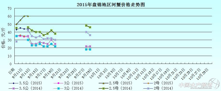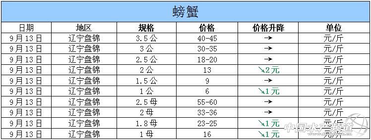 中國水產(chǎn)頻道獨(dú)家報(bào)道,據(jù)網(wǎng)友提供消息,2015年9月13日遼寧盤錦河蟹價(jià)格行情如下: 遼寧盤錦河蟹價(jià)格信息由盤錦市雙臺(tái)子區(qū)東風(fēng)市場新華街3號(hào)流波河蟹商行(電話:18040020068;15942702021;0427—6616465)提供,由于價(jià)格波動(dòng)及訂貨量影響,以上價(jià)格為收購價(jià)格,實(shí)際價(jià)格請(qǐng)聯(lián)系電話。 【關(guān)鍵字】:河蟹價(jià)格 河蟹行情 河蟹塘頭價(jià) (中國水產(chǎn)頻道水產(chǎn)價(jià)格信息共享Q群:245296163,歡迎提供各種水產(chǎn)品一線價(jià)格信息!) |