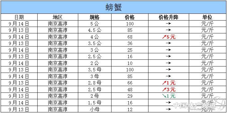 摘要: 2015年9月14日江蘇高淳河蟹價格行情