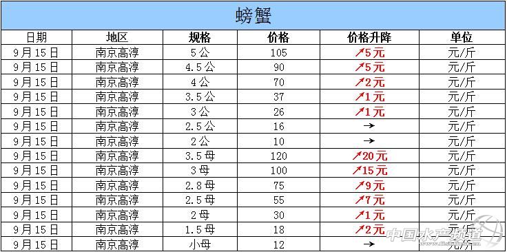 摘要: 2015年9月15日江蘇高淳河蟹價格行情