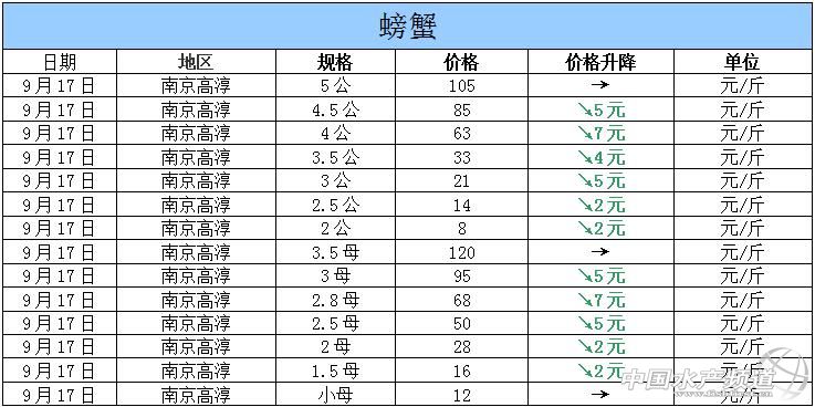 摘要: 2015年9月17日江蘇高淳河蟹價格行情